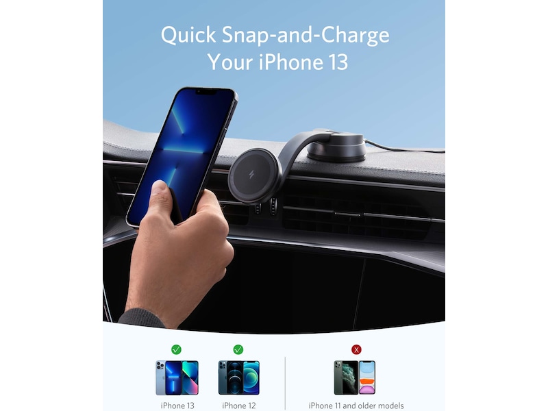 Håll bara din iPhone 13/12 över den magnetiska ytan och se hur den omedelbart snäpper fast på plats tack vare de superstarka magneterna, så är du redo att köra.