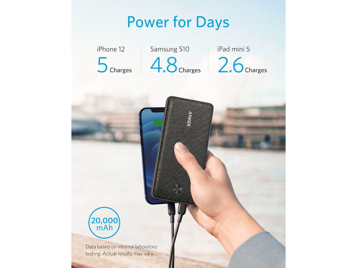 Den massiva kapaciteten på 20 000 mAh ger mer än 5 och en halv laddningar för iPhone XS, mer än 4 fulla laddningar för Samsung Galaxy S10 och över 2 och en halv laddningar för iPad mini 5.