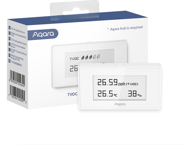 - Upptäcker luftkvalitet (TVOC), temperatur och luftfuktighet hemma