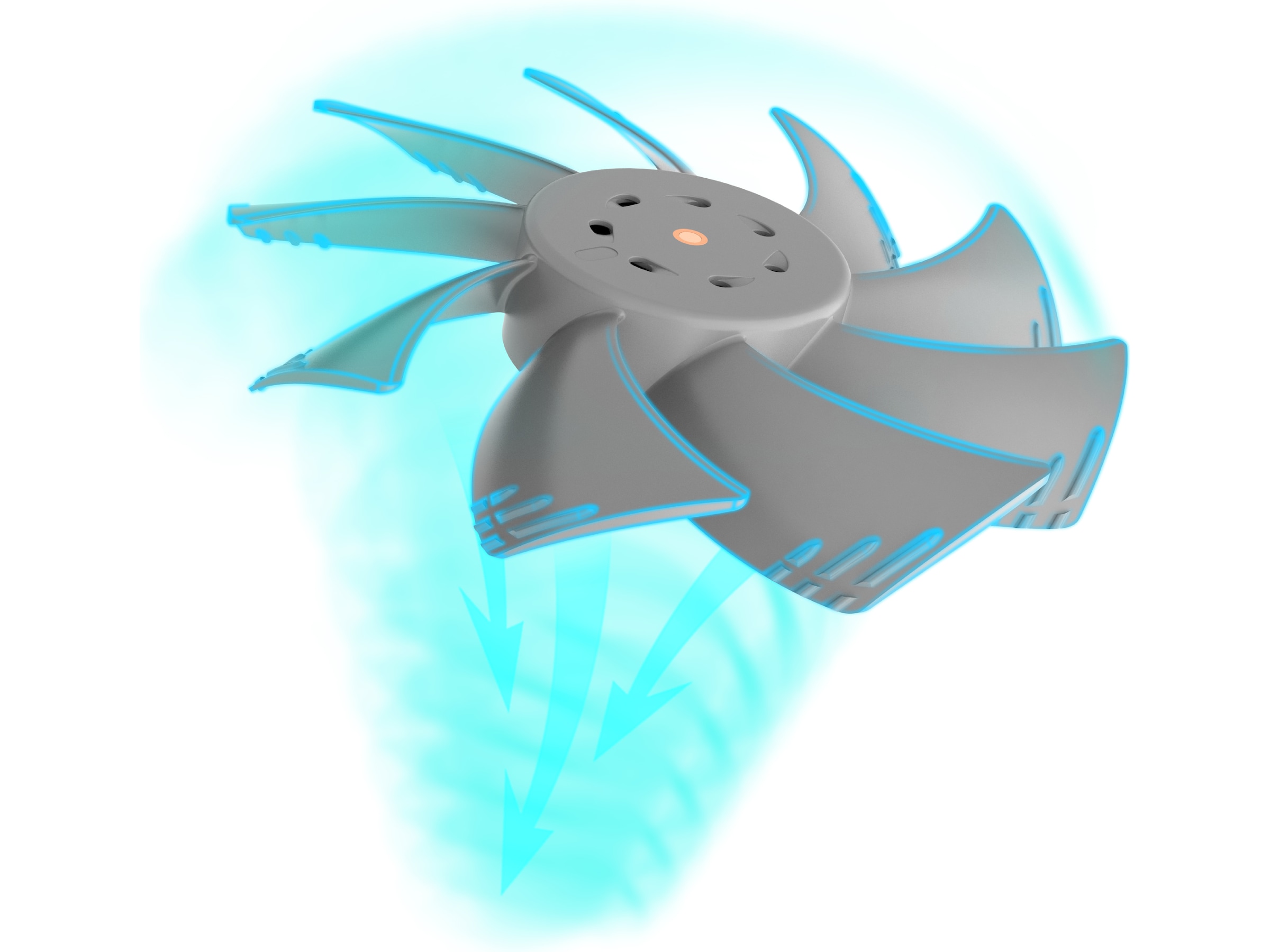 Egenskaper Intelligent PWM-fläktkontroll, Avancerad bladteknik, Avancerad design från bilindustrin, Tryckoptimerad fläkt, Trefasmotor