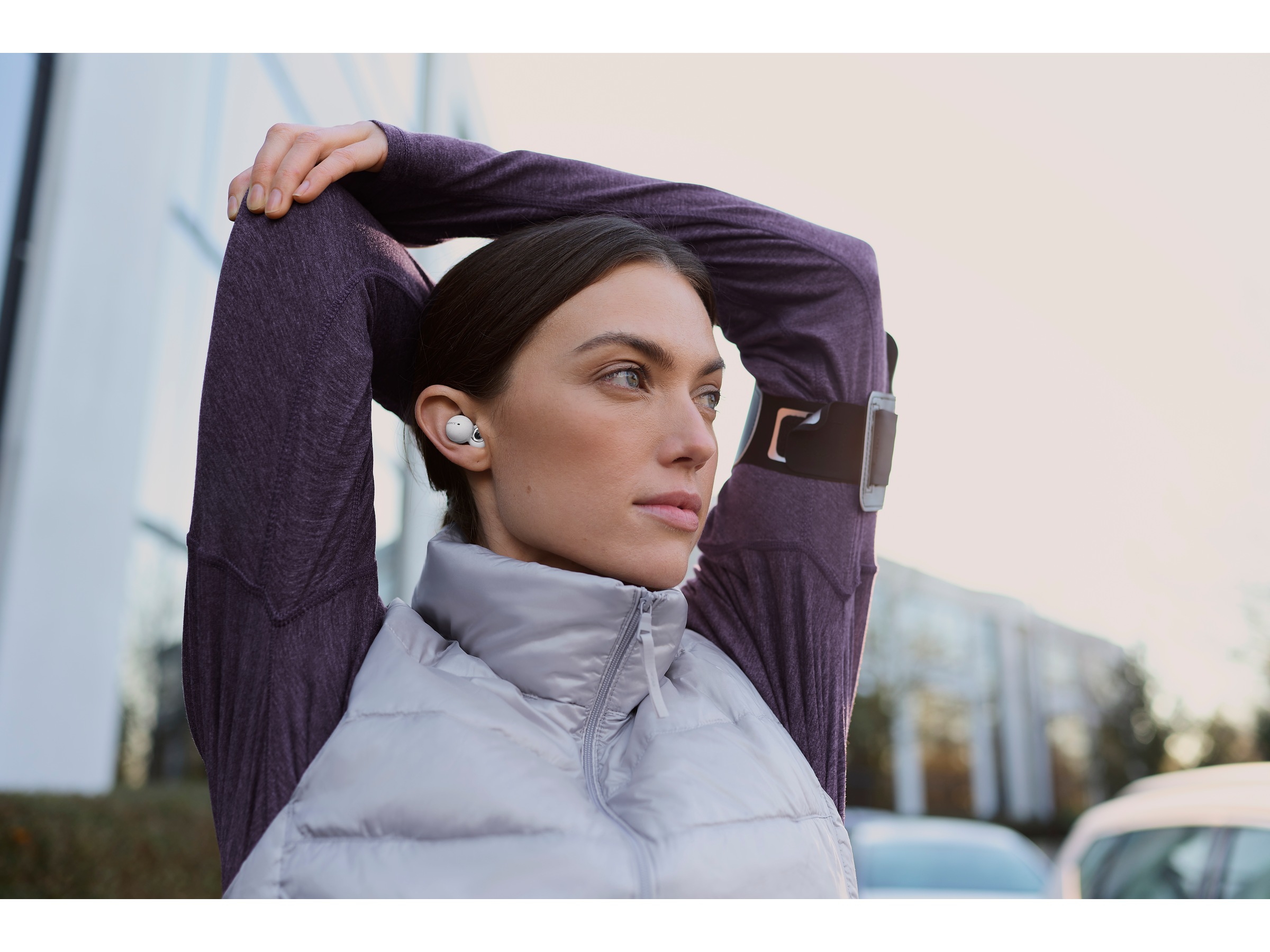 Adaptiv volymkontroll är en smart funktion som automatiskt optimerar volymen baserat på var du befinner dig. Njut av lägre volym på tysta platser och högre volym i bullrigare miljöer med dina trådlösa in-ear-hörlurar.
