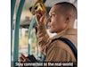 Så hur fungerar denna unika design? Den nyutvecklade drivenheten av ringtyp möjliggör ljudtransparens, så att du tydligt kan höra ljuden runt omkring dig. Det betyder att du med dessa Bluetooth®-hörlurarna kan höra din omgivning oavsett om du sitter i samtal, samt att du kan chatta med dina vänner samtidigt som du lyssnar på musik.