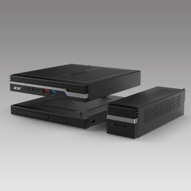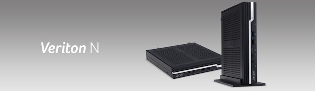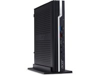 Med ett 1-litersformat kan stationära Veriton N placeras var som helst, dessutom kan den placeras platt eller upprätt med modulbasen. Du kan dessutom enkelt slå på din dator via skärmens strömbrytare.