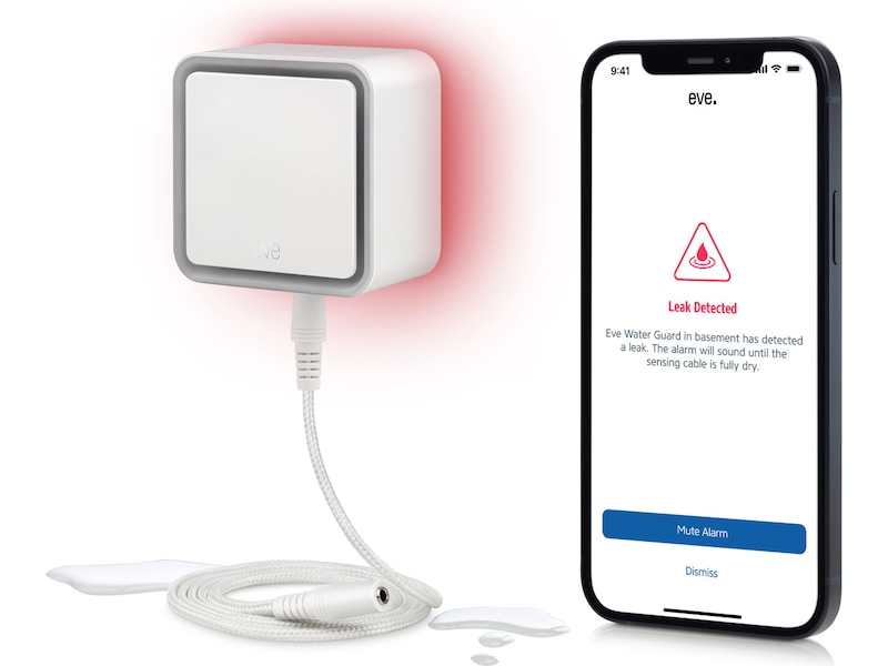 Vattenskador påverkar din livskvalitet negativt, ger dyra reparationsräkningar och är tyvärr något som händer väldigt ofta. Nu kan du skydda ditt hem mot sådana katastrofala händelser. Eve Water Guard upptäcker vattenläckor och varnar dig i det ögonblick de inträffar – visuellt, hörbart och via en app på din iPhone.