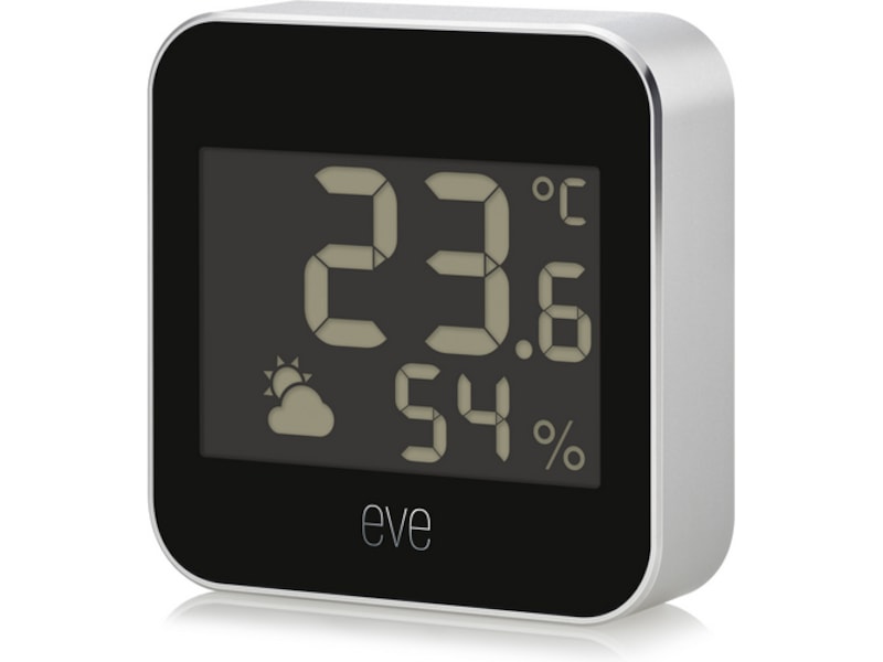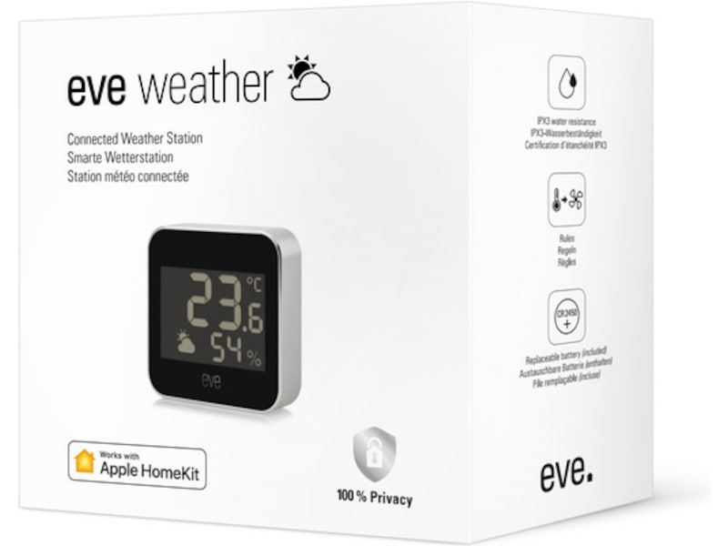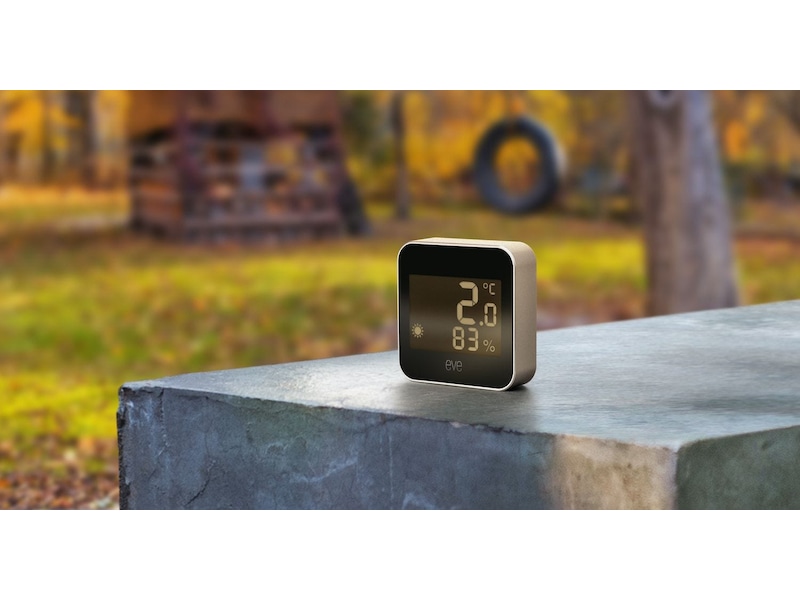Med Eve Weather kan du spåra din lokala utomhustemperatur, luftfuktighet och barometertryck över tid och se vädertrenden med en blick – på din iPhone eller direkt på skärmen. Eve Weather har en elegant, IPX4 vattentät design och framtidssäker trådnätverksteknik.