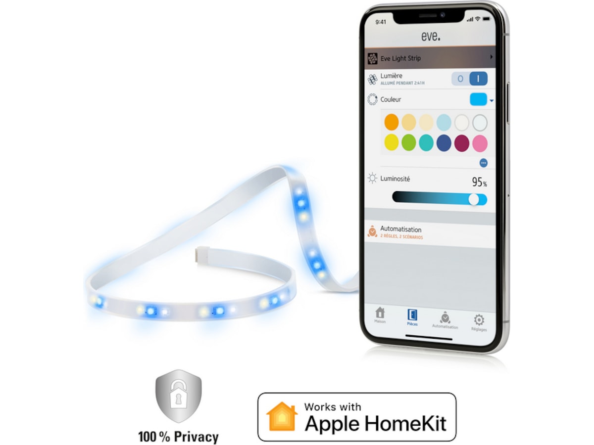 Premium trippeldiodarkitektur utstrålar det varmaste och coolaste av vita. Plus ett levande färgspektrum som spänner över alla nyanser du kan tänka dig. Maximera ljusstyrkan för en atmosfär i hela rummet, eller dämpa till en drömsk glöd av diskret elegans. Eve Ljusremsa symboliserar bekvämlighet och klass med den mest sofistikerade HomeKit-aktiverade LED-remsan.