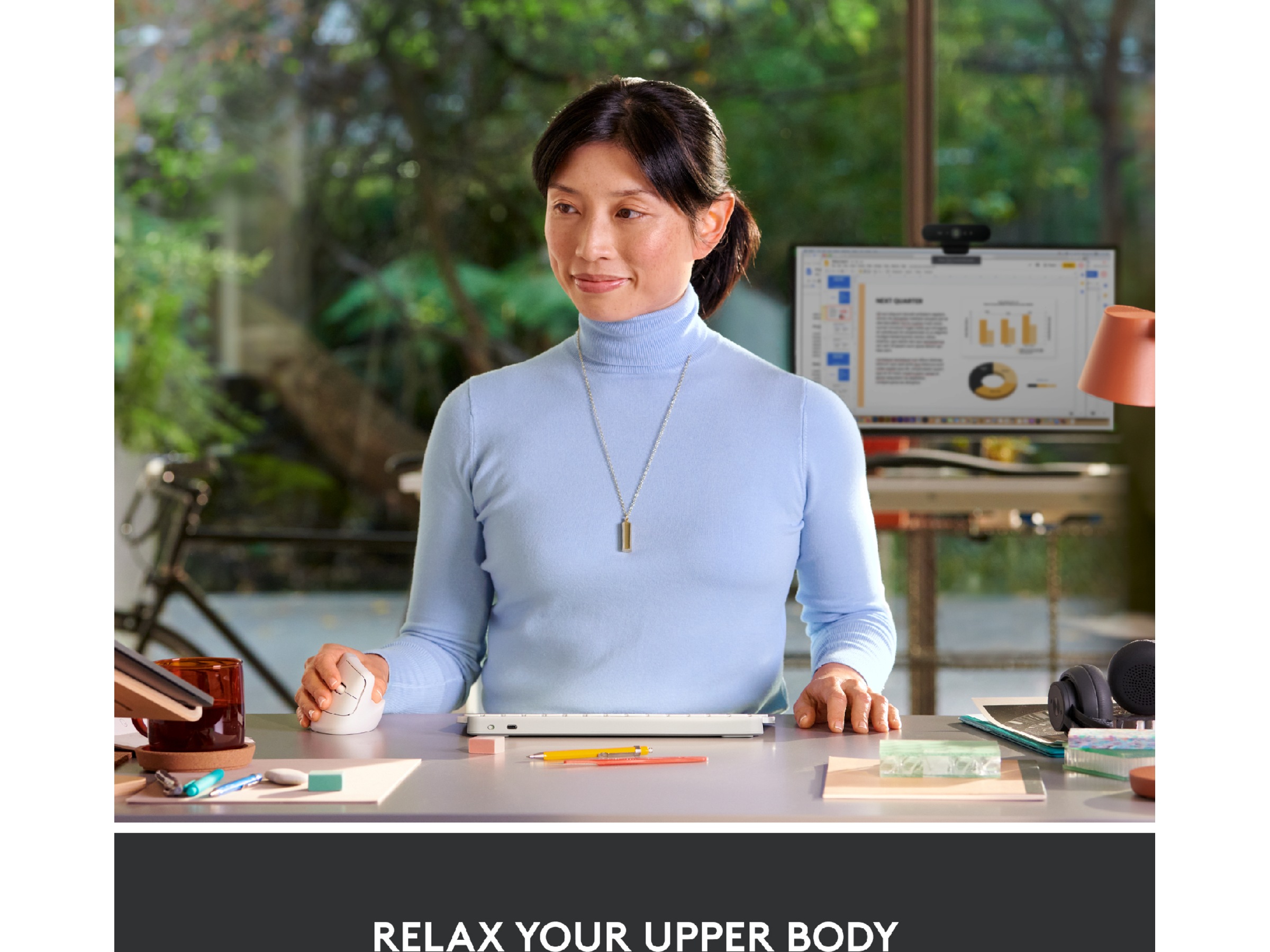 Lyft upp handen för omedelbar komfort med ett mjukt gummigrepp och bekvämt tumstöd. Få en mer naturlig position vid 57°. Och håll dig fokuserad från morgon till kväll med produktivitetsfunktioner som är skräddarsydda för din arbetsstil.