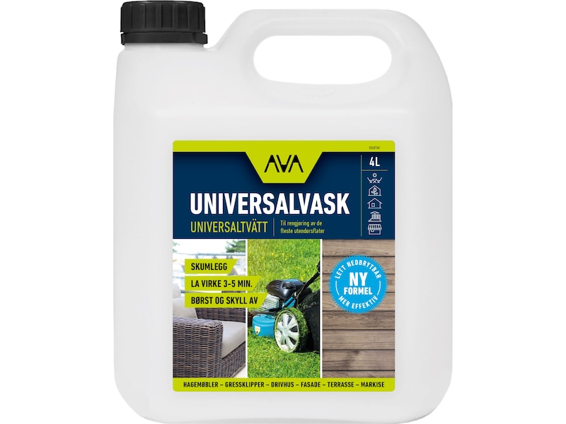 AVA universaltvätt är ett mycket smidigt, tvålbaserat rengöringsmedel som du kan använda på olika ytor och föremål runt om i huset – inklusive trädgårdsmöbler, markiser, presenningar, trädgårdsredskap, garageportar, räcken, fasader och terrasser.