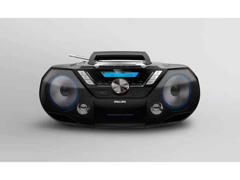 Philips bärbara CD Soundmachine är ett kraftfullt allt-i-ett-ljudsystem som du kan ta med dig överallt. Den släpper musiken fri från olika källor – Bluetooth, USB, CD, kassetter, DAB+ och FM-radio