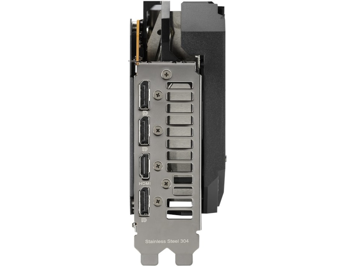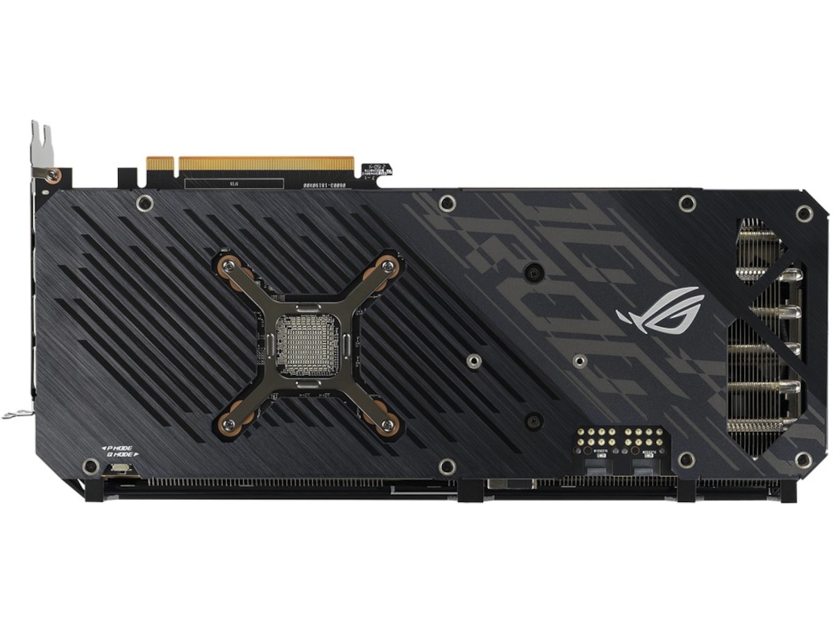 Undersidan av kortet avslöjar ett antal förbättringar. Större delen av baksidan är skyddad av ett bakstycke av metall med en stor ventil. Ventilen dirigerar varm luft till chassits fläktar i stället för att cirkuleras tillbaka in i kylaren. Ett GPU-fäste ger extra stabilitet till den viktiga kontakten mellan kärna och värmespridare. Rostfritt stål används till I/O-fästet för att skydda portarna och ge säkrare montering. Och en smidigt placerad Dual Bios-omkopplare gör det möjligt att justera kortets prestandaprofil utan mjukvara.