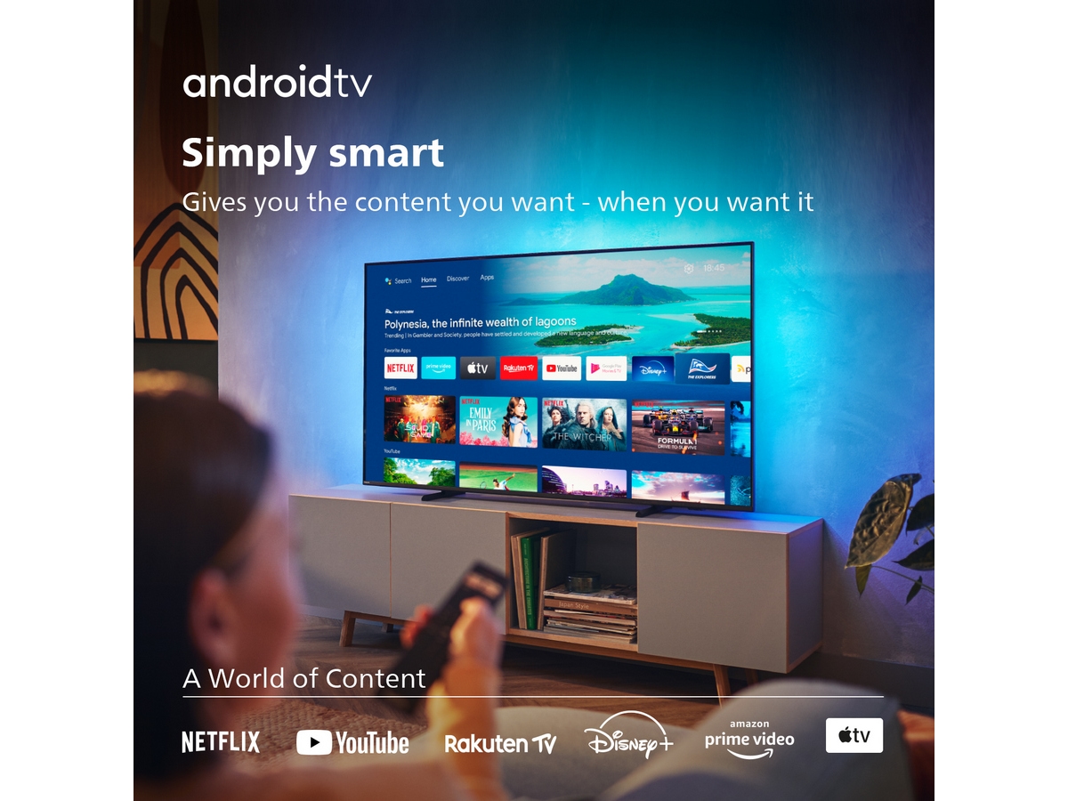 Få en skarp och intensiv bild plus Dolby Atmos-ljud och jämna spelrörelser. Den här Android-TV:n är perfekt när du vill att allt ska se bra ut och låta bra. Ambilight gör att allt du tittar på känns ännu mer intensivt.