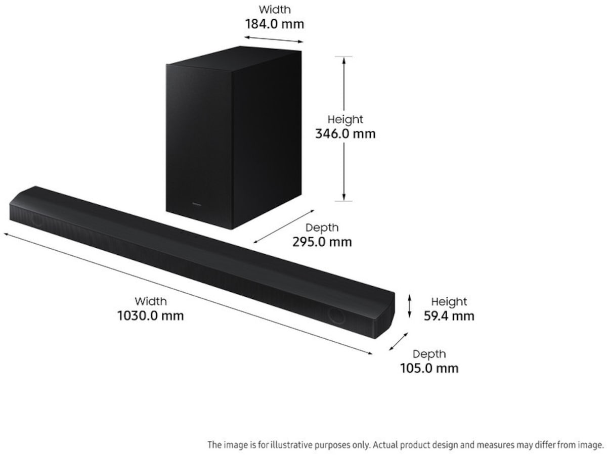 Subwoofer: 18.4 cm x 29.5 cm x 34.6 cm / 5.1 kg, Soundbar: 103 cm x 10.5 cm x 5.94 cm / 3.1 kg
