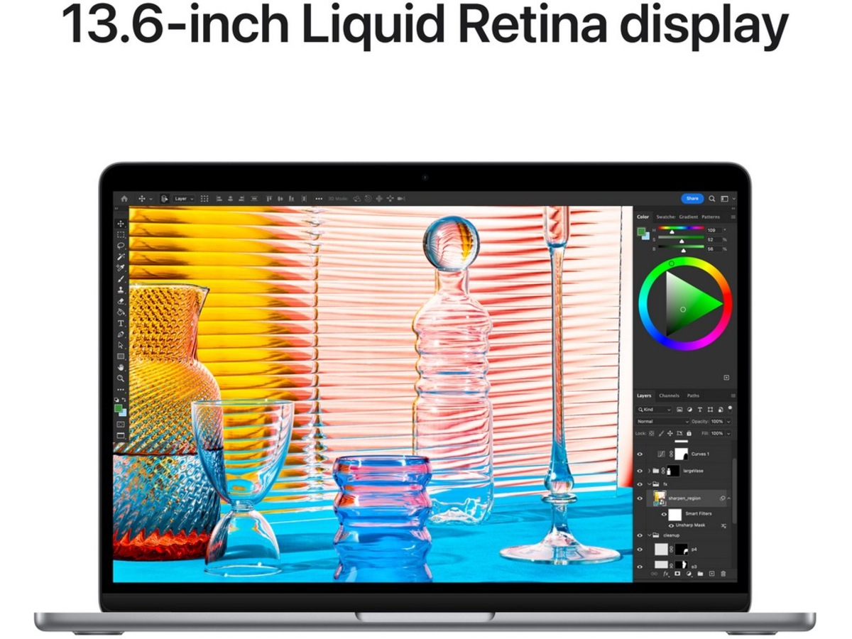 • 13,6-tums Liquid Retina-skärm med 500 nit ljusstyrka och stort färgomfång (P3) ger starka färger och otroliga detaljer3