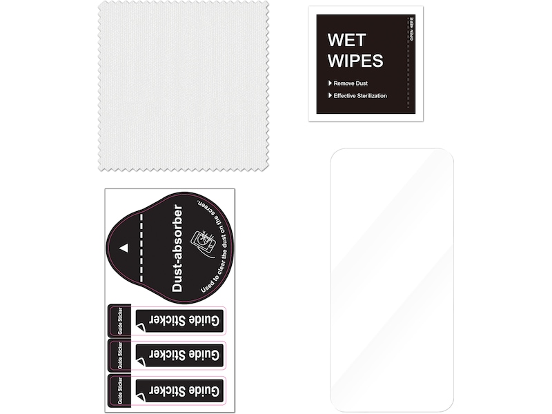 Förpackningsinnehåll Skärmskydd, Dammborttagningsmärke, Vägledningsklistermärken, Rengöringsduk, Våta rengöringsdukar