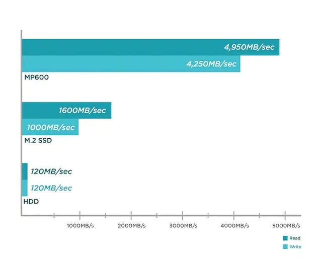 MP600 är en PCIe 4.0 SSD med fantastisk lagringsprestanda och upp till 10 gånger snabbare sekventiell läs- och skrivhastighet än vissa SATA SSD:er och den är upp till 50 gånger snabbare än vissa traditionella HDD:er. MP600 är också helt bakåtkompatibel med dagens PCIe 3.0-plattformar.