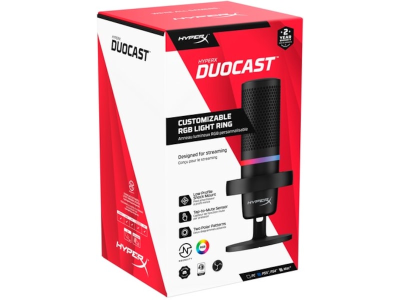 En monteringsadapter medföljer som gör att den passar de flesta fästen. Dessutom är DuoCast kompatibel med pc, PS4™, PS5™ och Mac®. Med hjälp av HyperX NGENUITYprogramvaran kan du anpassa RGB-ljusringen och börja sända i din egen välbekanta stil.