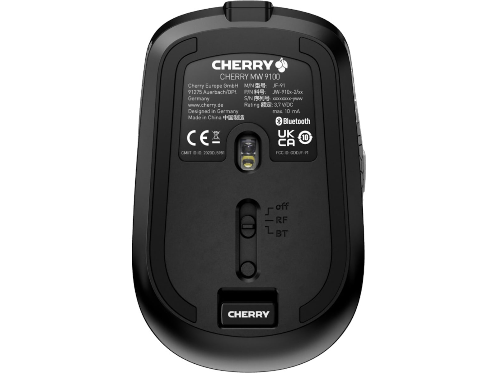 MW 9100 kan anslutas till din enhet med Bluetooth eller 2,4 GHz-radiomottagaren. Med hjälp av skjutreglaget på undersidan av den trådlösa musen kan du enkelt växla mellan båda anslutningslägena. I båda fallen utförs överföringen med AES-128-kryptering. När du reser, förvara CHERRY MW 9100 i transportväskan (ingår). USB-mottagaren lagras magnetiskt inuti musen.