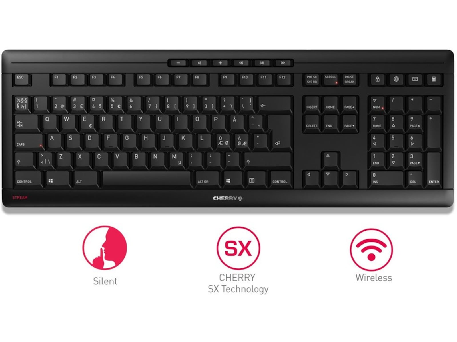Letar du efter ett underhållsfritt och sladdlöst tangentbord för frekventa maskinskrivare och uppskattar du fördelarna med CHERRY SX saxteknologi? CHERRY STREAM KEYBOARD WIRELESS är det rätta valet för dig. Den kombinerar alla fördelarna med det välbekanta STREAM KEYBOARD med 2,4 GHz trådlös teknologi, vilket gör den till en riktig allrounder i vardagsarbetet.