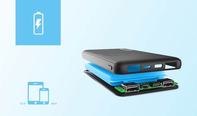 - Ladda snabbt upp powerbanken via den medföljande mikro-USB-kabeln eller USB-C-porten