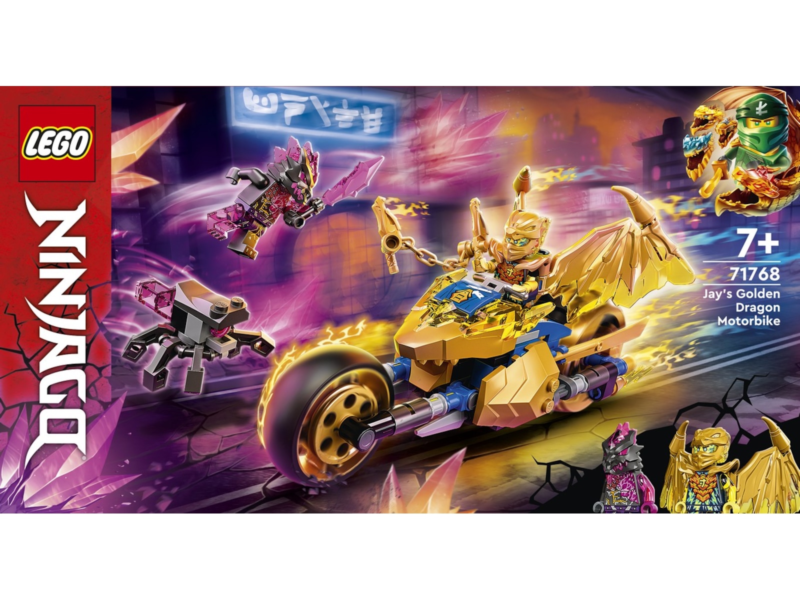 • NINJAGO® motorcykellekset – Barn kan återskapa spännande racing- och stridsscener från tv-serien NINJAGO: Crystallized med setet LEGO® NINJAGO Jays gyllene drakmotorcykel (71768).