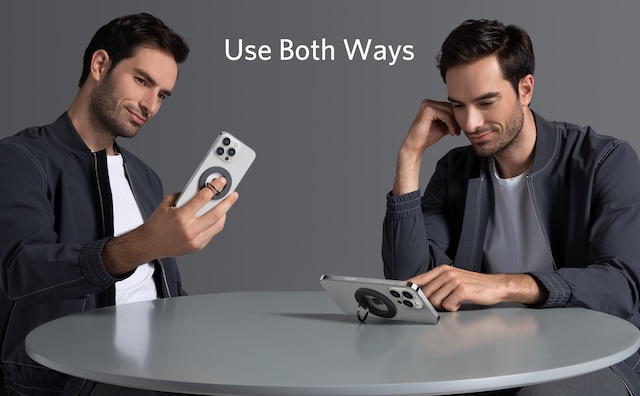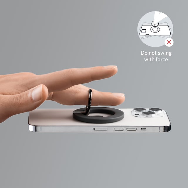 Ringhållaren har starka magneter som fäster på baksidan av din iPhone för att säkerställa en säker montering. Nu kan du sms:a, ta bättre bilder eller titta på videor med bara en hand. (OBS: Använd utan fodral eller med ett magnetiskt telefonfodral som är kompatibelt med iPhone)