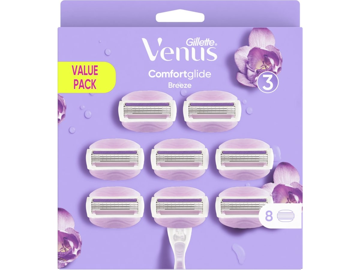 Venus rakblad är utformade för kvinnliga former. Venus Comfortglide Breeze rakhyvlar för kvinnor har 3 blad, för en slät och nära rakning.