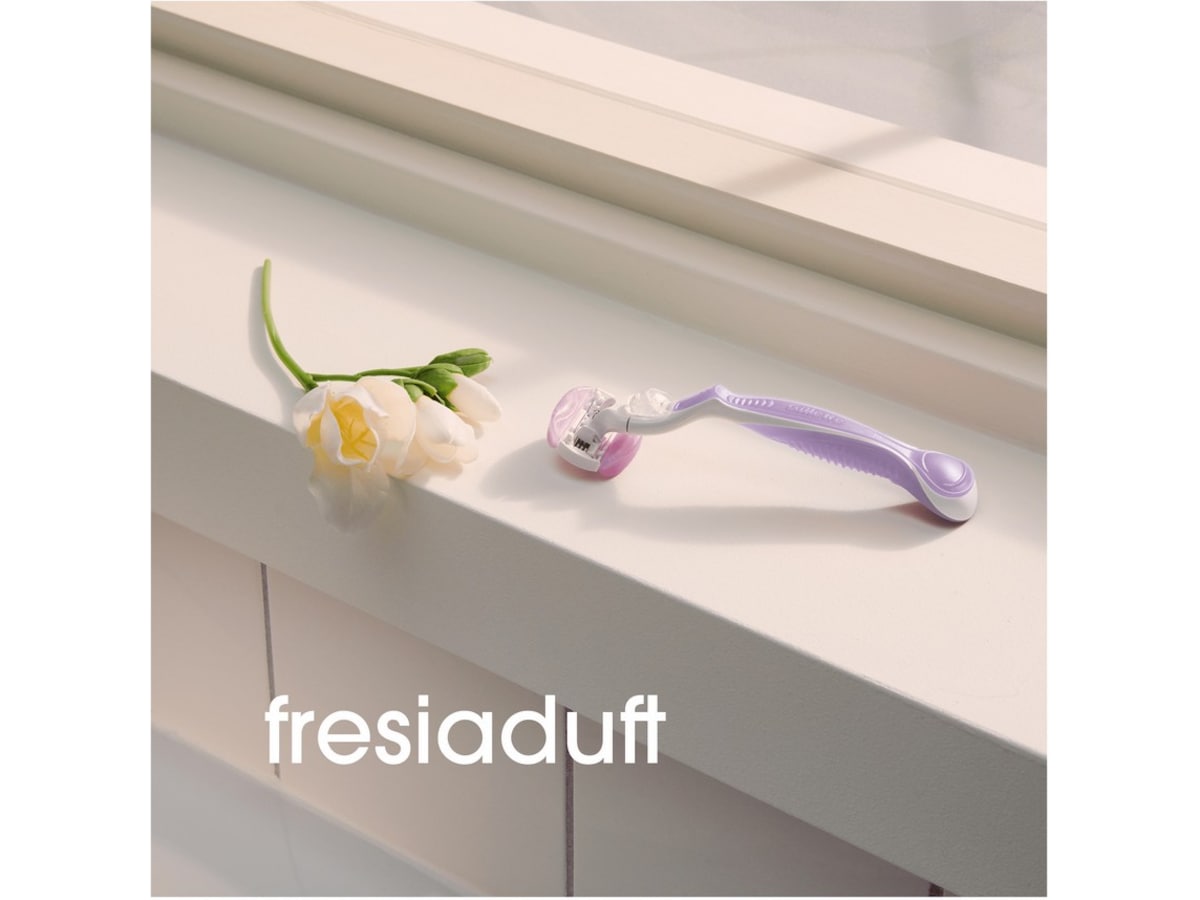 - SKYDDAR HUDEN: rakhyvelns gelremsor ger ifrån sig extra vårdande ingredienser som löddrar lätt, med doft av freesia, som skyddar huden mot skråmor, skärsår och irritation