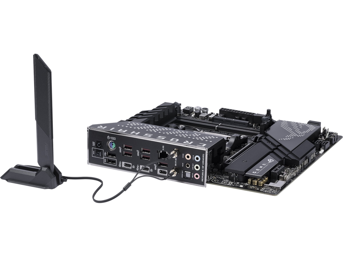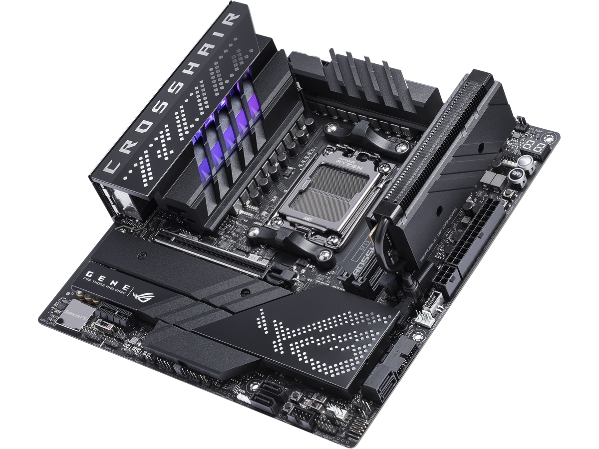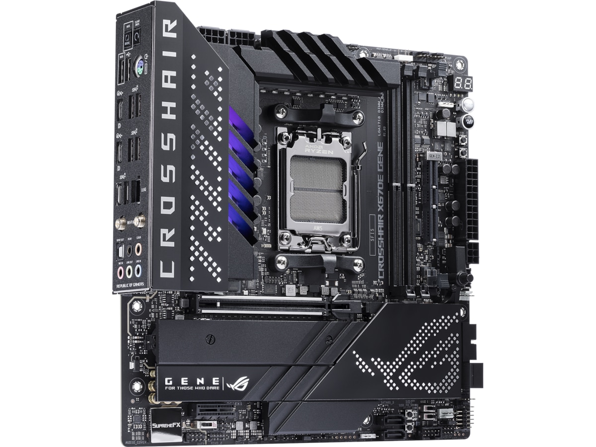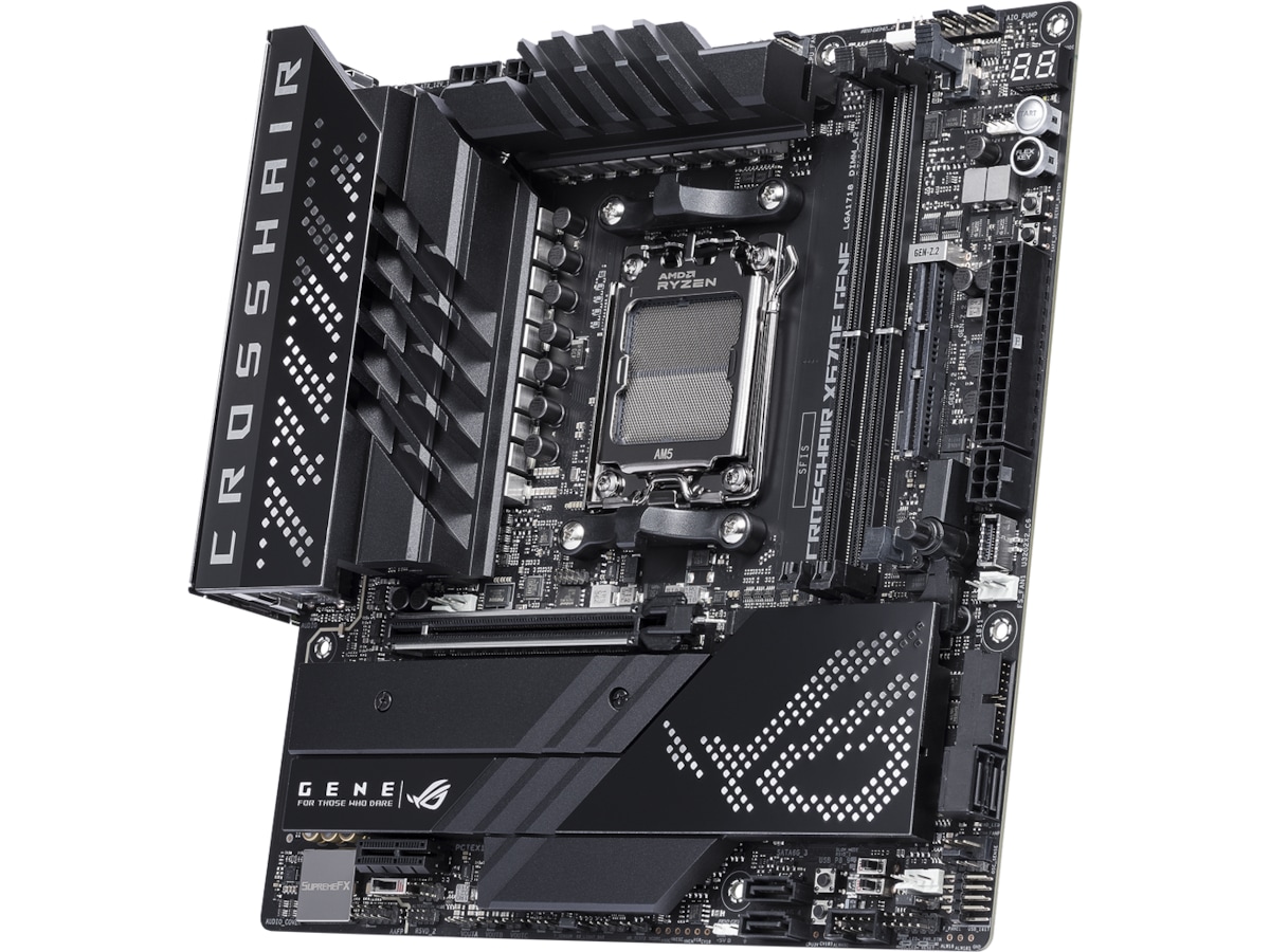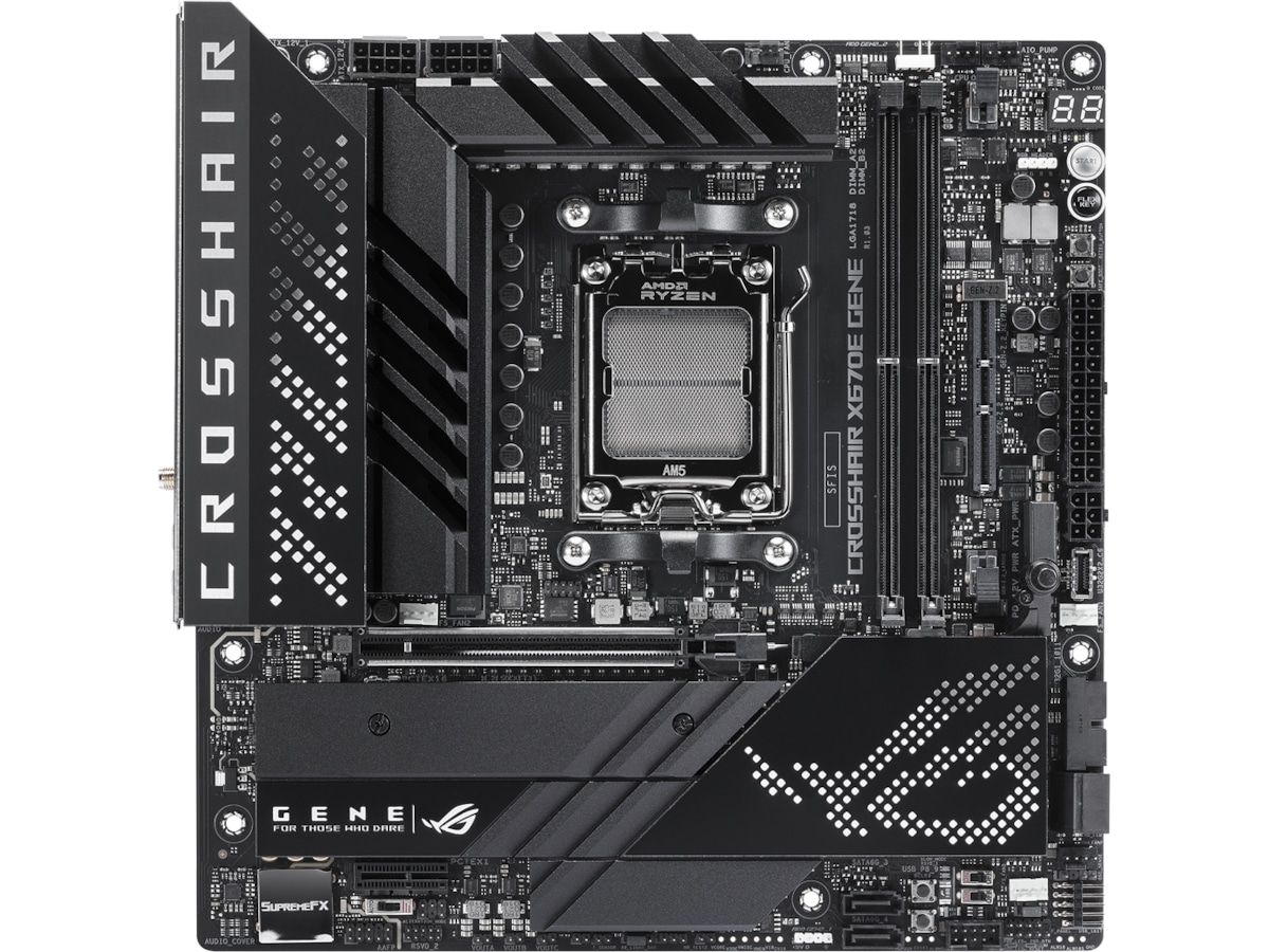 ROG Crosshair X670E Gene är skapad genom att kopiera DNA från ROG och blanda i ett SFF-enzym. Resultatet är ett mATX-kraftverk som ger dig allt. Med uppumpad strömförsörjning och stora kylflänsar är den maxad ihop med processorerna i AMD Ryzen™ 7000-serien och kryddar med en mix av PCIe 5.0, DDR5, WiFi 6E och USB4 för entusiaster som vill ha ett kompakt AM5-bygge på skrivbordet.