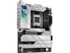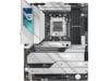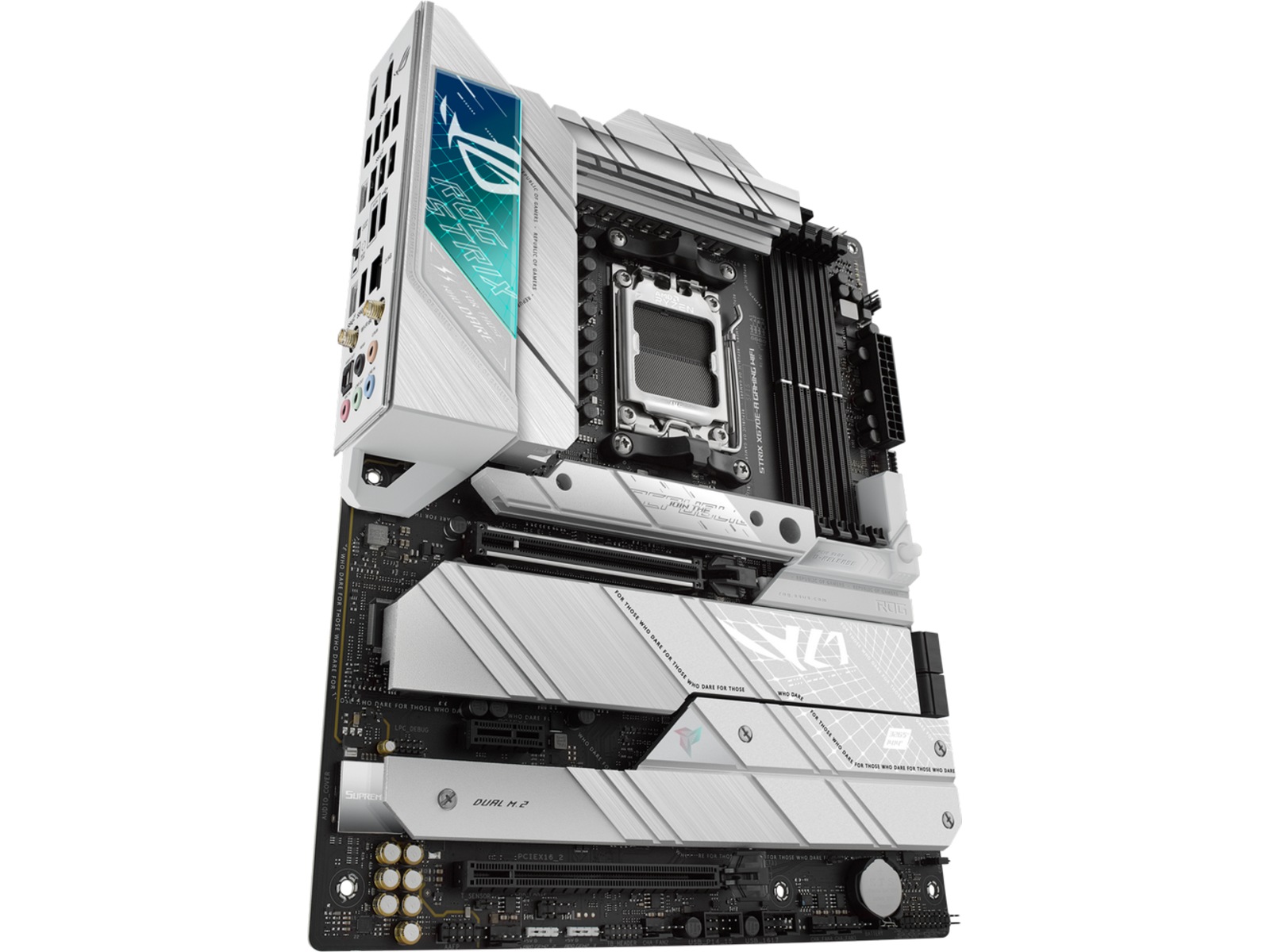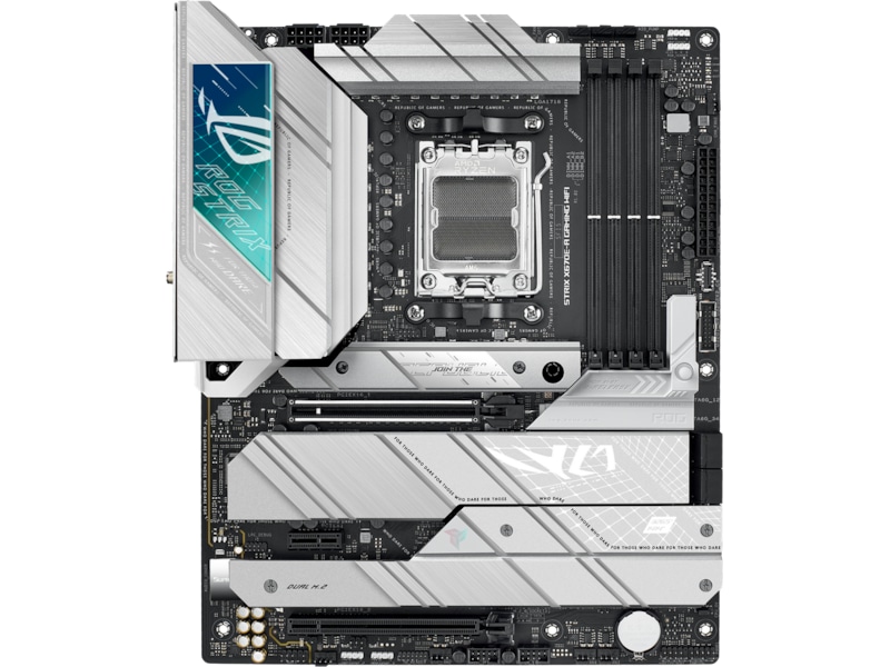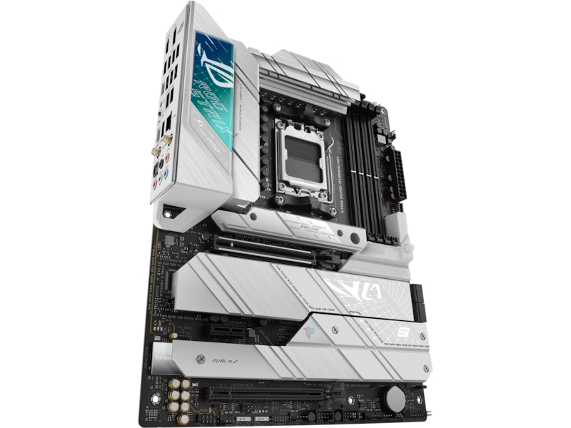 ROG Strix X670E-A Gaming WiFi kommer att locka till sig blickar med en slående silvervit finish som står i kontrast till en djärv Aura RGB-upplyst rutnätsdesign. Parallella streck och böjd text på VRM-, M.2- och PCH-kylflänsarna binder samman hela estetiken med ett rent, modernt utseende.