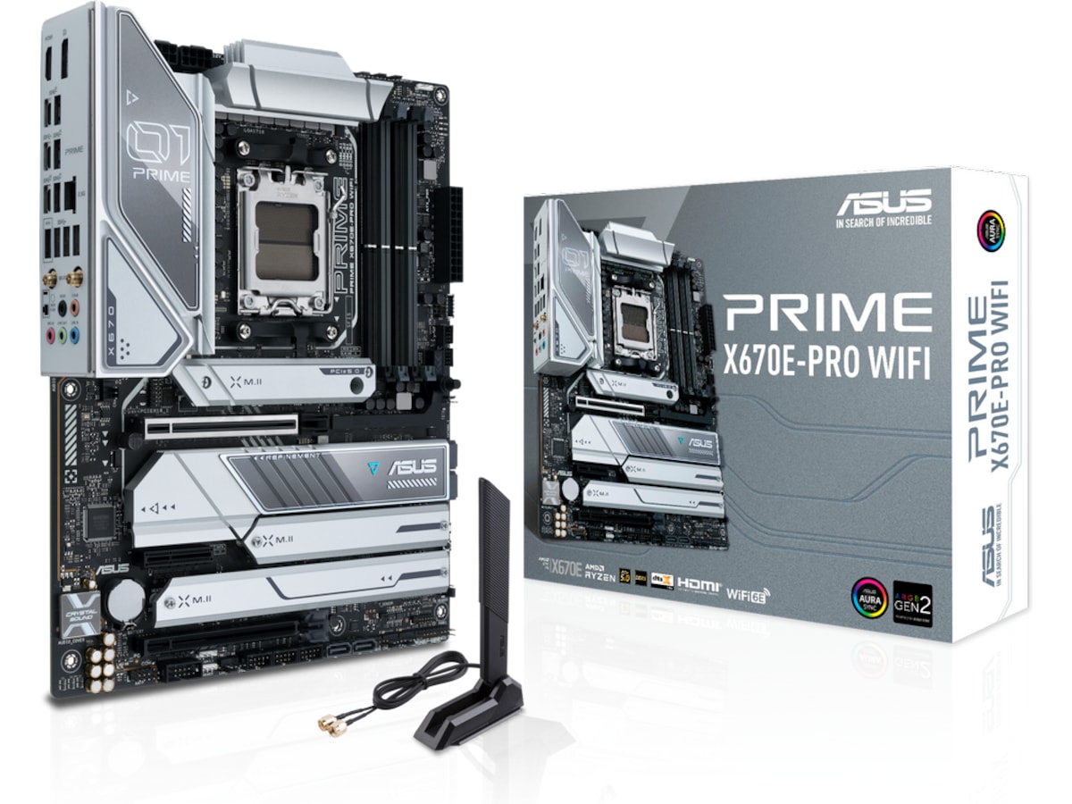 ASUS Prime-seriens moderkort är konstruerade av experter för att släppa loss den fulla potentialen hos processorerna i AMD Ryzen 7000-serien. Med en robust strömdesign, omfattande kylningslösningar och intelligenta inställningsalternativ ger PRIME X670E-PRO WIFI användare och gör-det-själv-byggare en rad prestandaoptimeringar genom intuitiva mjukvaru- och firmwarefunktioner. ASUS PRIME X670E-PRO WIFI erbjuder allt detta i ett elegant paket med futuristiskt utseende, centrerat kring rymdskeppsestetik, med en silverfärgad namnskylt och chipsetskydd.