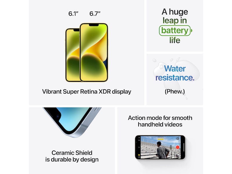 *iPhone 14 Plus har testats under kontrollerade laboratorieförhållanden och har enligt IEC-standard 60529 en salt-, stänk- och dammtålighetsklass IP68 (maximalt djup på 6 meter i upp till 30 minuter). Stänk-, spill- och dammresistensen är inte permanenta förhållanden. Hållbarheten kan försämras på grund av normalt slitage. Ladda aldrig en våt iPhone. Användarhandboken beskriver hur du rengör och torkar den. Garantin täcker inte skador som orsakats av vätska.