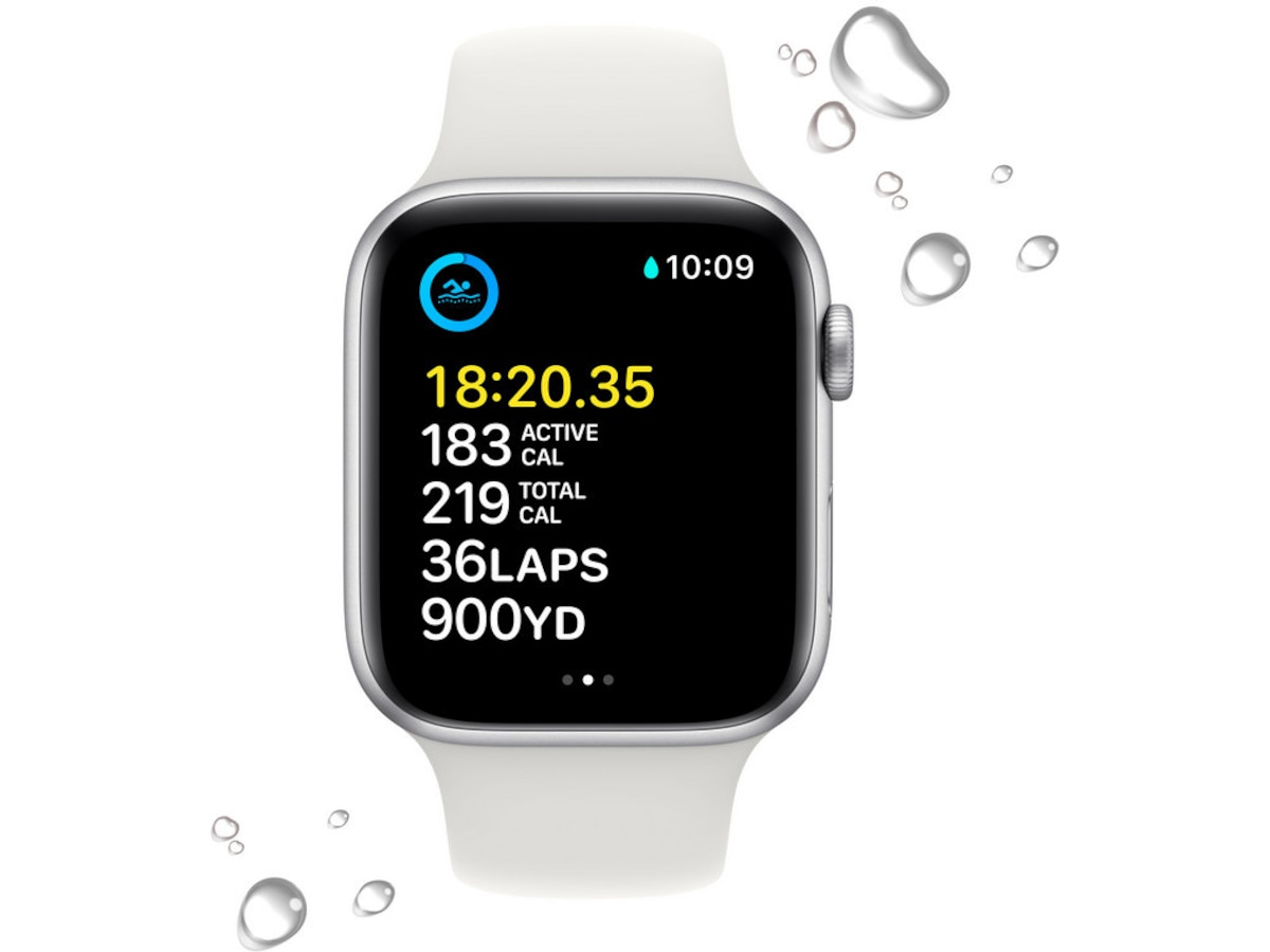 6) Apple Watch SE har en vattentäthetsklassning på 50 meter enligt ISO-standard 22810:2010. Det gör att den kan användas till aktiviteter i vattenytan, till exempel bad i pool eller i saltvatten. Apple Watch SE bör dock inte användas för dykning, vattenskidor eller andra vattenaktiviteter som involverar hög hastighet eller nedsänkning i djupt vatten. Vattentålighet är inte ett permanent tillstånd och kan försämras med tiden. Se support.apple.com/no-no/HT205000 för mer information.