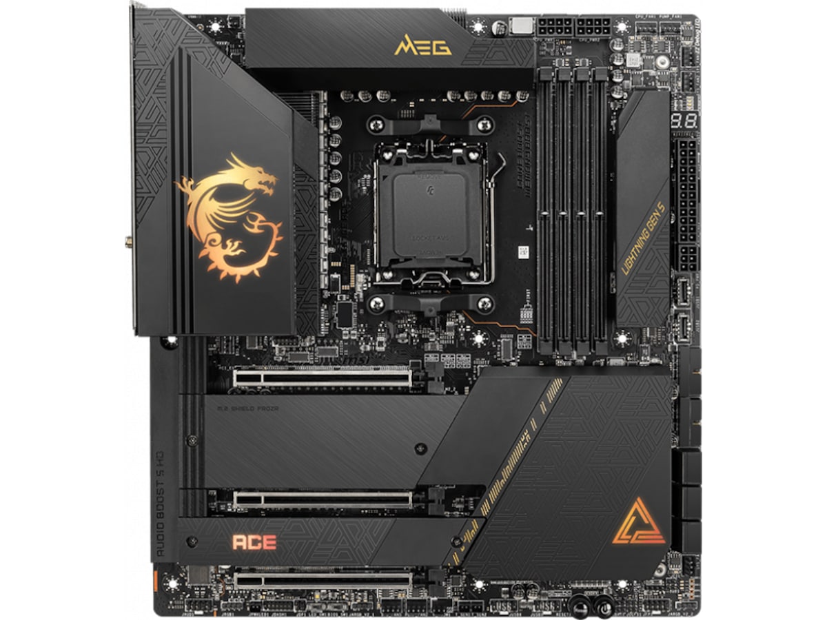 1 x M.2 socket (Key E), 1 x PCIe 5.0 x16 (x8-läge), 3 x M.2 socket (2260/2280 M.2 Key M-plats), 4 x DIMM 288-stift, 1 x M.2 socket (2260/2280/22110 M.2 Key M-plats), 1 x PCIe 5.0 x16 (x4-läge), 1 x CPU, 1 x PCIe 5.0 x16