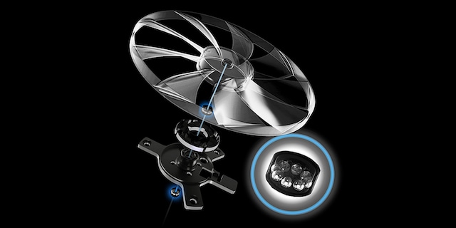Axial-tech-fläktkonstruktionen har ett mindre fläktnav som ger plats för längre blad och en barriärring som ökar lufttrycket nedåt. Till PSU:erna i ROG Loki har vi skalat konstruktionen till 120 mm så att allting hålls svalt vid låga varvtal samtidigt som det orsakar mindre oväsen.