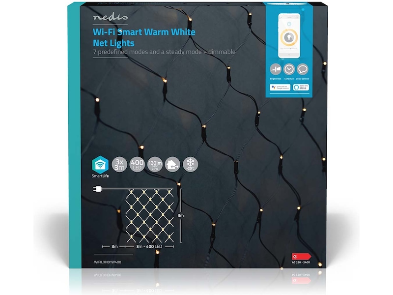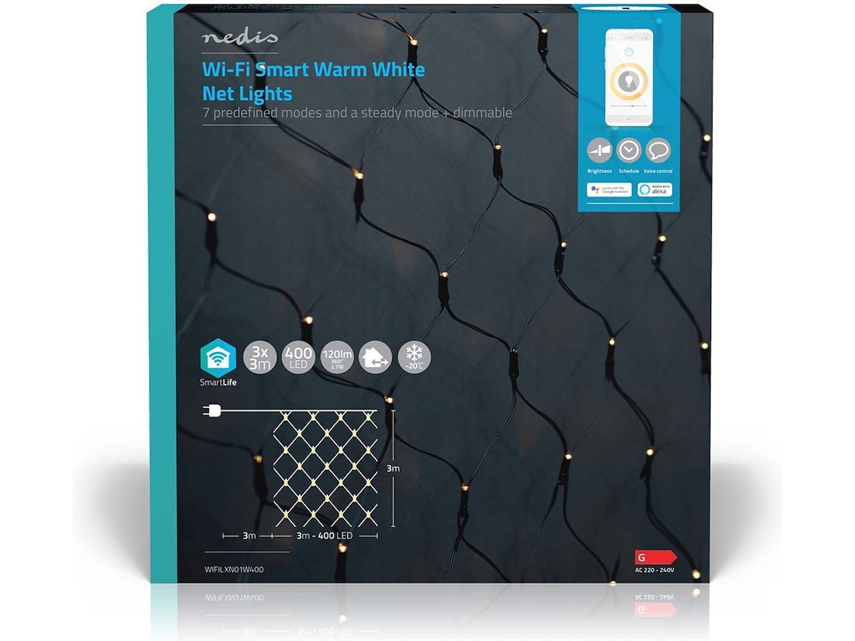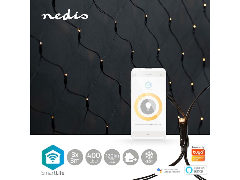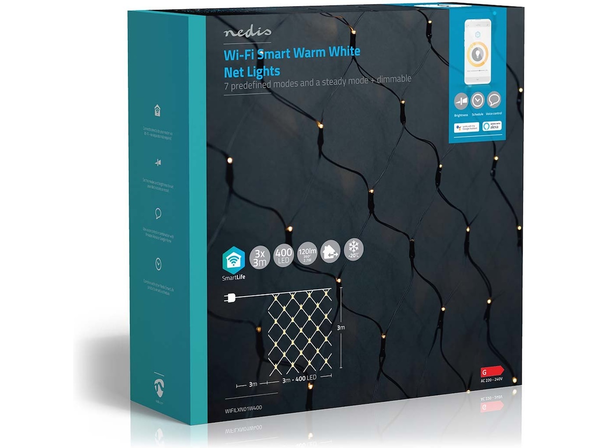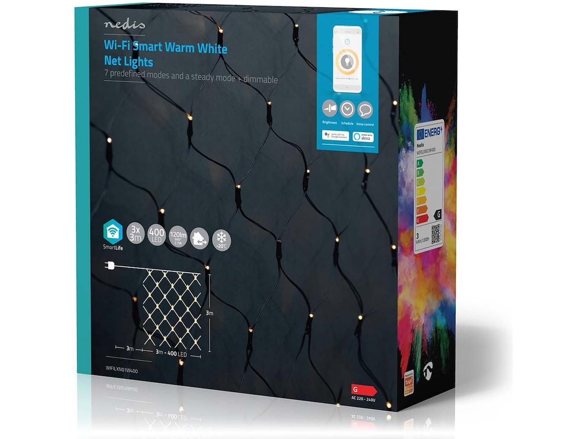 Med Nedis® lättanvända, smarta Wi-Fi-nät med 400 varmvita LED-lampor och måtten 3 x 3 meter är det enkelt att skapa en magisk stämning kring buskar, fasader, tak eller föremål.