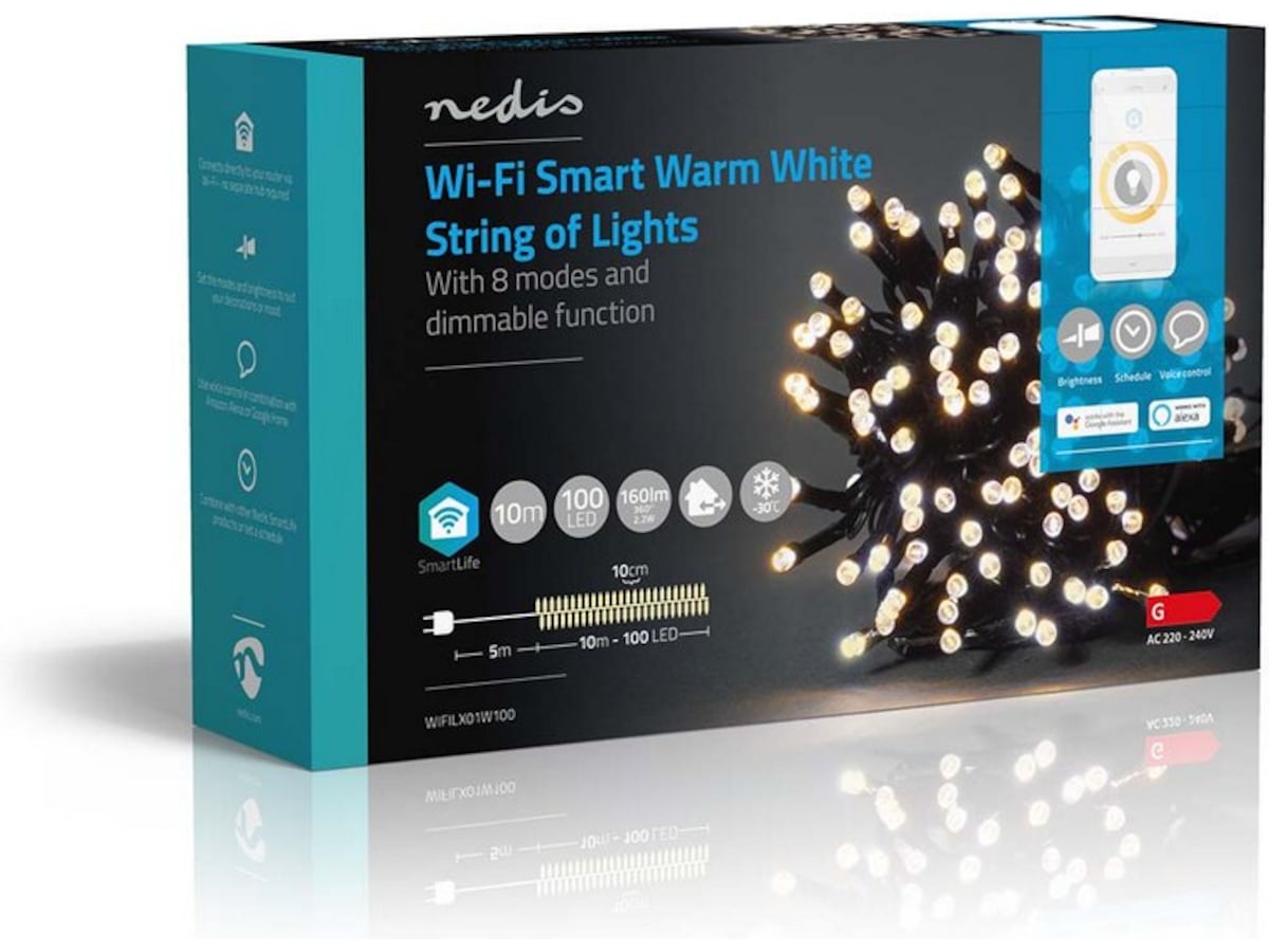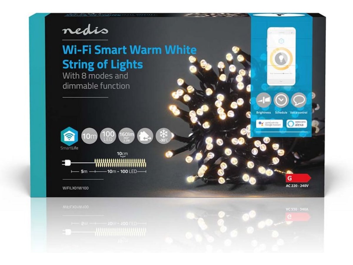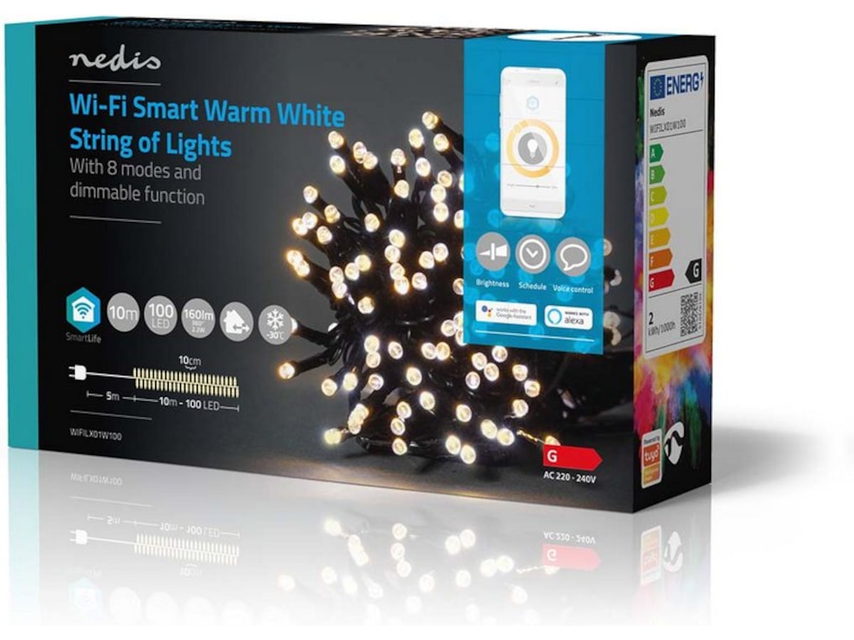 Wi-Fi-lyskæden kan installeres uden en gateway og integreres direkte i dit trådløse netværk – dette forenkler installationen og sparer yderligere omkostninger. Betjen lysene ved hjælp af den gratis Nedis® SmartLife-app, hvor du kan oprette automatiserede funktioner baseret på tidsindstillede tidsplaner, solnedgang eller andre Nedis® SmartLife-produkter. I kombination med Google Home eller Amazon Alexa kan du endda give stemmekommandoer for at ændre lyskædens mønstre.