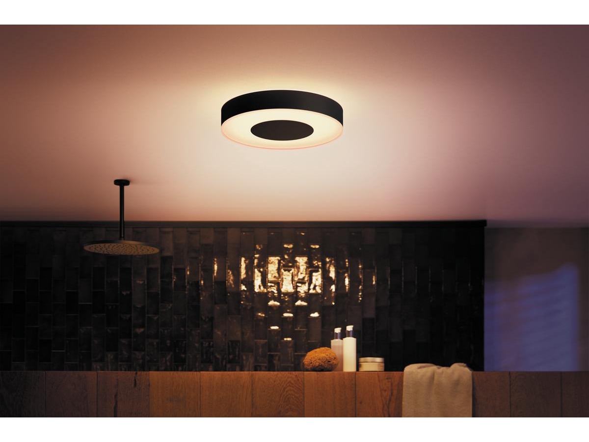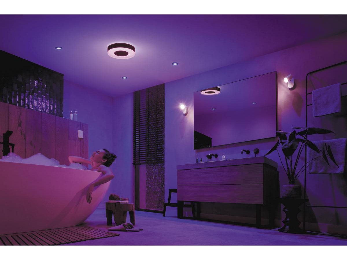 Denna runda taklampa i svart har en subtil och modern design som passar in i alla hem. Den ger både ett dekorativt uppåtriktat ljussken och en bred, jämn nedåtriktad belysning som enkelt lyser upp medelstora rum. Med White and color ambiance kan du anpassa belysningen till varje daglig rutin och varje tillfälle. Välj mellan 16 miljoner färger och justera ljusets intensitet, temperatur och nyans. Använd olika ljusscener för att förvandla badrummet till ett lyxigt spa när du vill njuta av ett bad på en avkopplande söndag, och låt ljuset från en tropisk ö hjälpa dig att varva ner efter en lång dag på jobbet. Rätt belysning är särskilt viktigt under de skiftande och mörka årstiderna i Norden. Använd färgat ljus för att skapa den rätta stämningen, välj kallt vitt ljus för att ge dig energi en mörk vintermorgon och ställ in en varm gyllene ton för dina badrumsrutiner på kvällen innan du går och lägger dig. Xamento är IP44-klassad, vilket gör den säker mot vattenstänk.