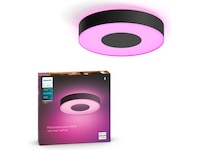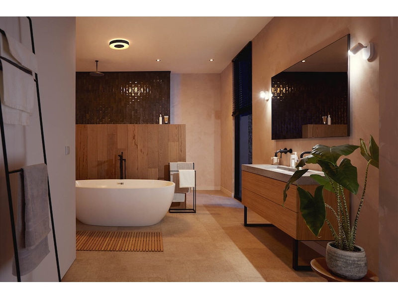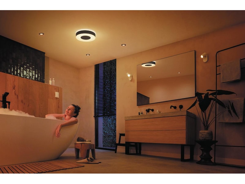 Denna runda taklampa i svart har en subtil och modern design som passar in i alla hem. Den ger både ett dekorativt uppåtriktat ljussken och en bred, jämn nedåtriktad belysning som enkelt lyser upp medelstora rum. Med White and color ambiance kan du anpassa belysningen till varje daglig rutin och varje tillfälle. Välj mellan 16 miljoner färger och justera ljusets intensitet, temperatur och nyans. Använd olika ljusscener för att förvandla badrummet till ett lyxigt spa när du vill njuta av ett bad på en avkopplande söndag, och låt ljuset från en tropisk ö hjälpa dig att varva ner efter en lång dag på jobbet. Rätt belysning är särskilt viktigt under de skiftande och mörka årstiderna i Norden. Använd färgat ljus för att skapa den rätta stämningen, välj kallt vitt ljus för att ge dig energi en mörk vintermorgon och ställ in en varm gyllene ton för dina badrumsrutiner på kvällen innan du går och lägger dig. Xamento är IP44-klassad, vilket gör den säker mot vattenstänk.
