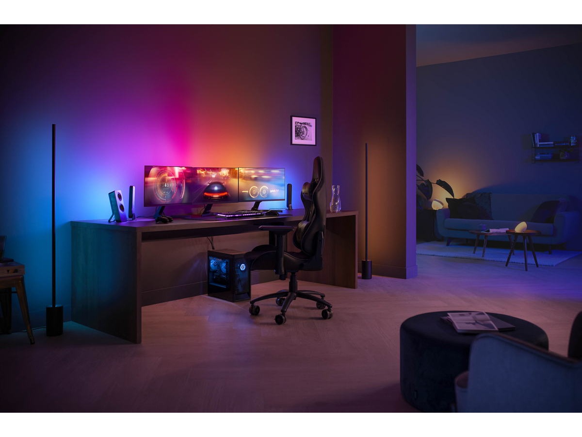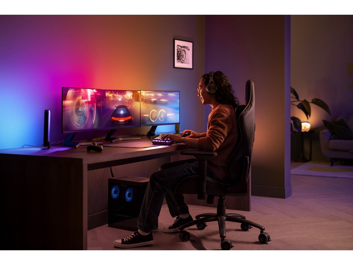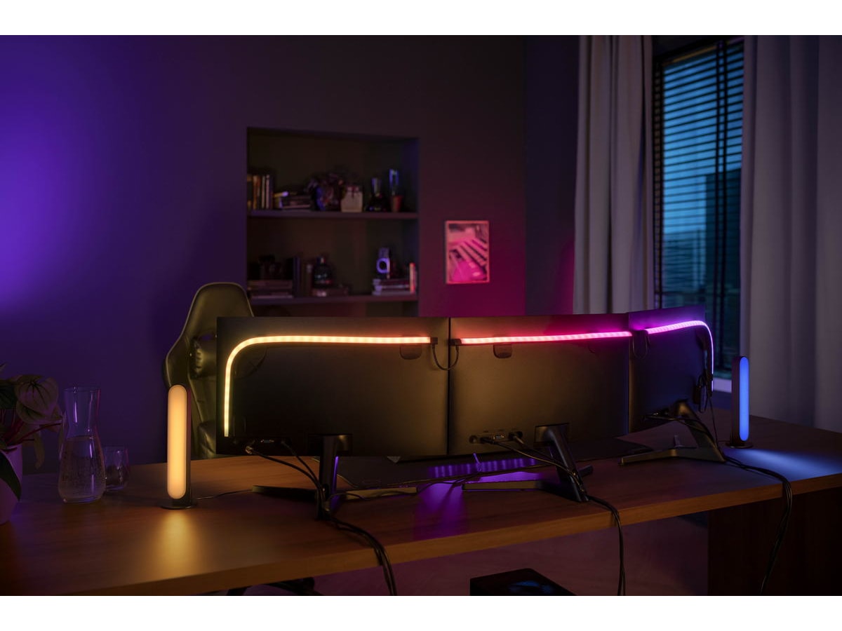 Den ingår i Hue Play gradient-serien och är utformad för att förbättra din hemunderhållning och ge dig en unik uppslukande upplevelse, där synkroniserat färgglatt ljus öppnar upp för en helt ny dimension för att njuta av ditt favoritinnehåll – oavsett om det är TV-serier, film, musik eller gaming. När du kopplar ihop din Play gradient PC lightstrip med den kostnadsfria Hue Sync-skrivbordsappen kommer din spelupplevelse att fyllas med reaktiva flerfärgade ljuseffekter som blinkar, dansar, lyser upp och byter färg i perfekt synk med vad som händer på skärmen. Den skapar fantastisk surroundbelysning på egen hand, men den kan också kombineras med andra färgkompatibla Hue-ljuskällor och lampor i ditt Hue-underhållningsområde för att förvandla hela rummet till spelets slagfält. Denna PC lightstrip är särskilt utformad för en uppsättning med tre skärmar på 24"-27” och fästs direkt på baksidan av skärmarna med hjälp av det medföljande monteringsmaterialet. Den finns även för enskilda skärmar i storlekarna 24"-27” och 32"-34”. Den kräver en Hue Bridge (ingår inte).