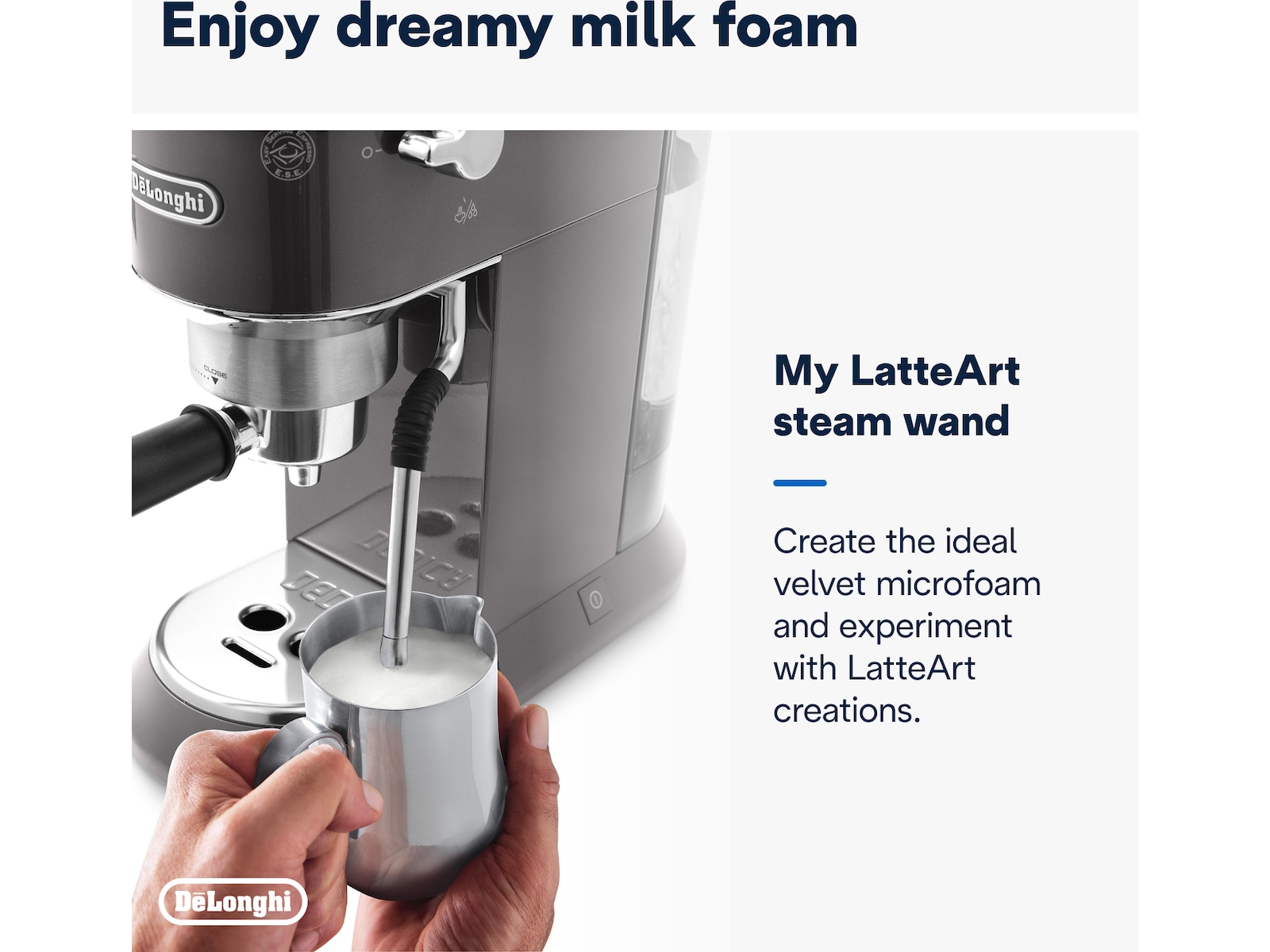 - My LatteArt steam wand: Manuell texturering av mjölk för perfekt mikroskum och en autentisk barista-upplevelse.