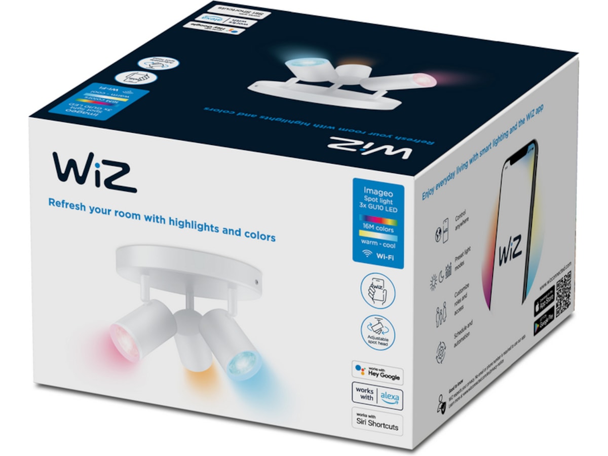 Med tre justerbara huvuden får du en modern lampa i vitt som lyser upp och drar uppmärksamheten till de områden och föremål som du älskar mest. Ditt hem och dina ögon kommer att älska möjligheten att justera belysningen till 16 miljoner olika färger och välja ljusets intensitet och temperatur, så att du äntligen får den högkvalitativa LED-belysning som du förtjänar. Du kommer också att bli imponerad av bekvämligheten och tjusningen med dynamiska ljusscener och unika funktioner som fyller ditt hem med vackra, flerfärgade ljuseffekter. Njut av belysning som efterliknar havets vågor, en glödande eldstad, eller varför inte skapa en mjuk övergång i belysningen som följer dagens naturliga ljusmönster. Med den kostnadsfria och lättanvända WiZ-appen kan du enkelt styra din smarta belysning, eller använd röststyrning via din smartphone eller en röstassistent. Låt WiZ hjälpa dig att automatisera dina belysningsbehov och ta hand om alla dagliga rutiner åt dig. Det har aldrig varit enklare eller roligare att ha den perfekta belysningen för varje tillfälle.