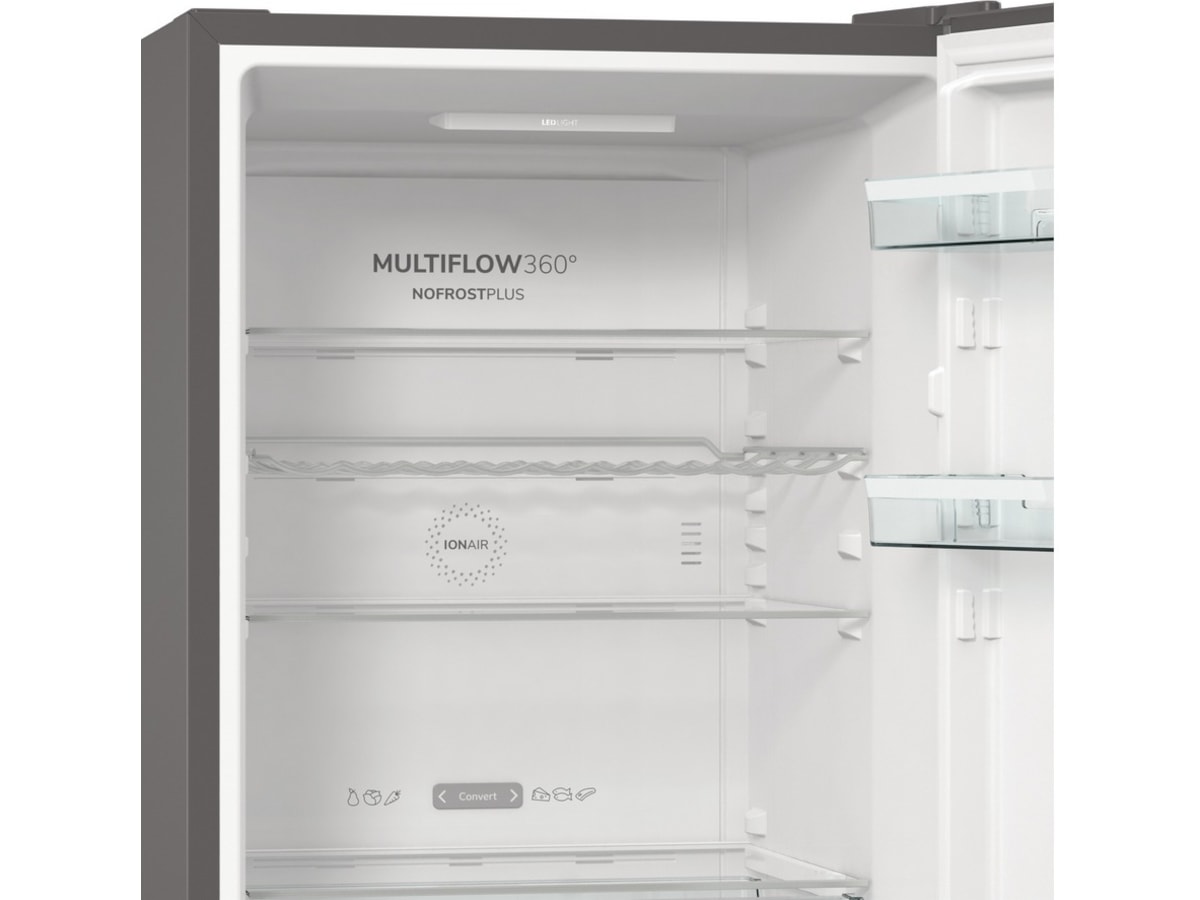 IonAir genererar negativt laddade joner inuti skåpet, och som sprids jämnt i hela kylskåpsfacket tack vare nya MultiFlow 360°-systemet. Luften som berikats med dessa anjoner bevarar smak och tar bort obehagliga lukter.