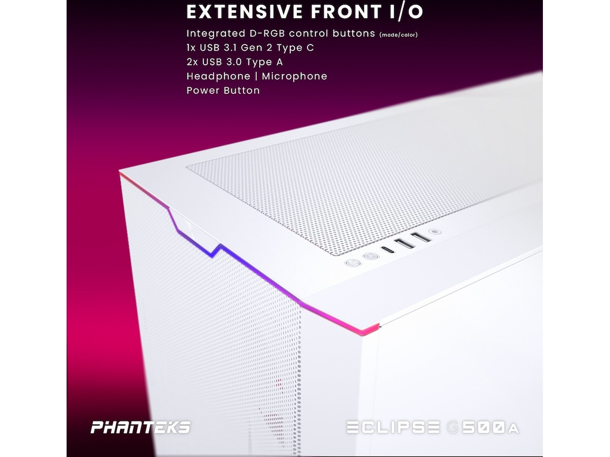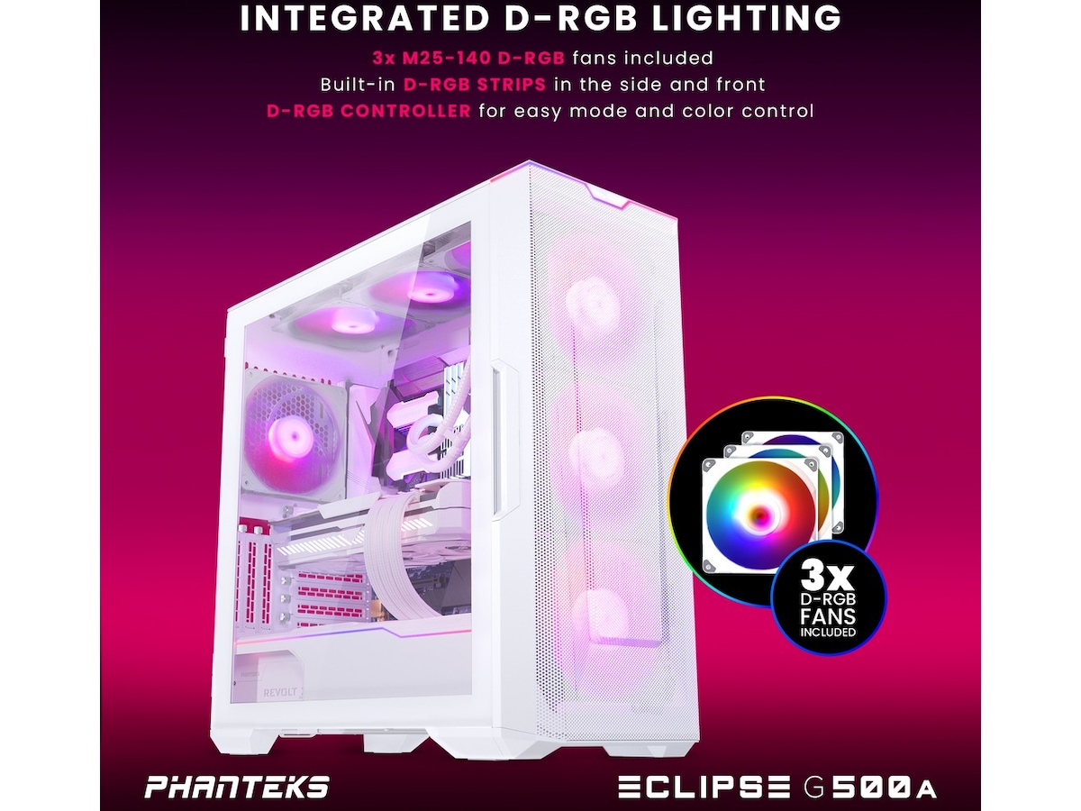 Eclipse G500A är utrustad med sin egen Digital-RGB-kontroller och gör belysningen enkel. Den är mjukvarufri med manuell kontroll och programmerad med smakfulla ljuseffekter ur lådan. Tre M25-140 D-RGB-fläktar är förinstallerade och en LED-remsa är integrerad längs PSU-kåpan och toppanelen. Liksom alla Phanteks belysningsprodukter kan Digital-RGB-kontrollen utökas med fler belysningsprodukter och/eller synkroniseras med moderkort för att möjliggöra programvarustyrning.