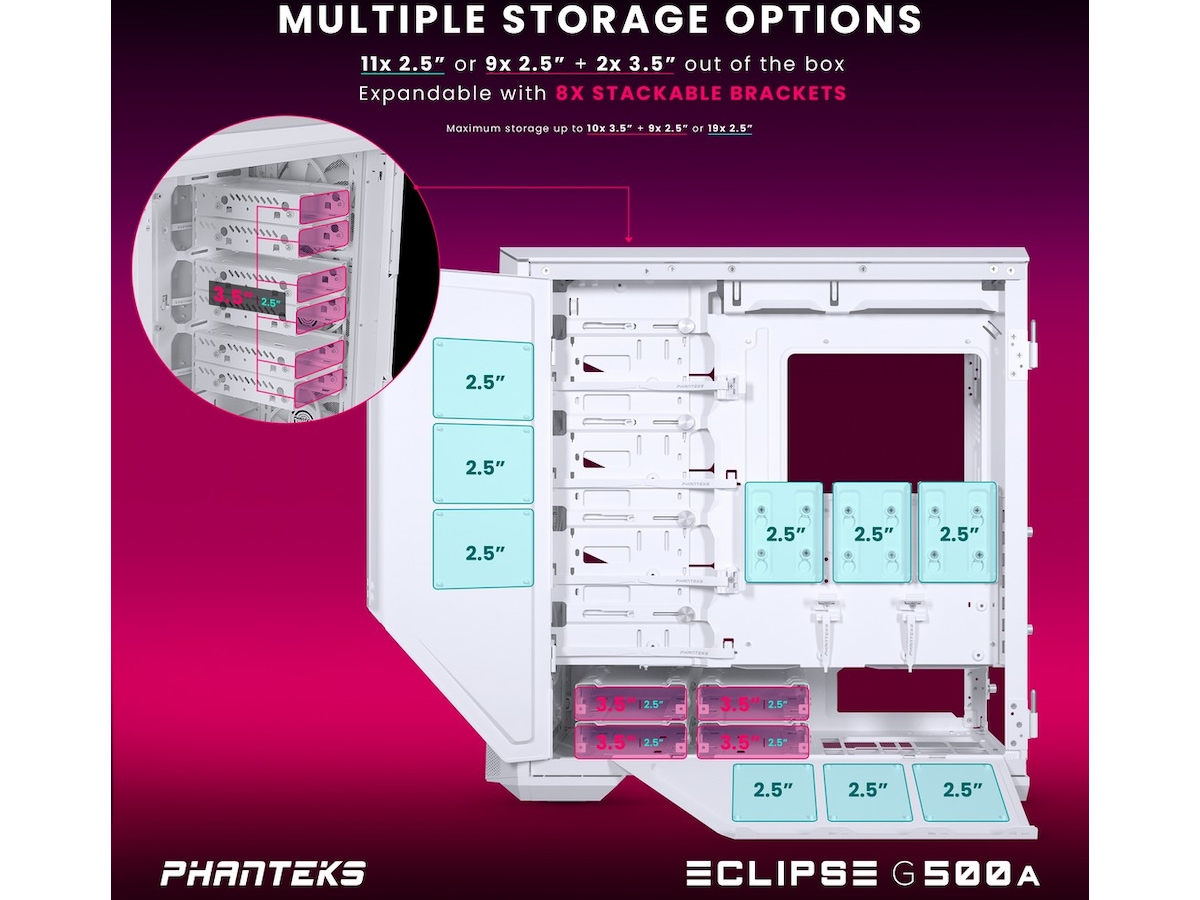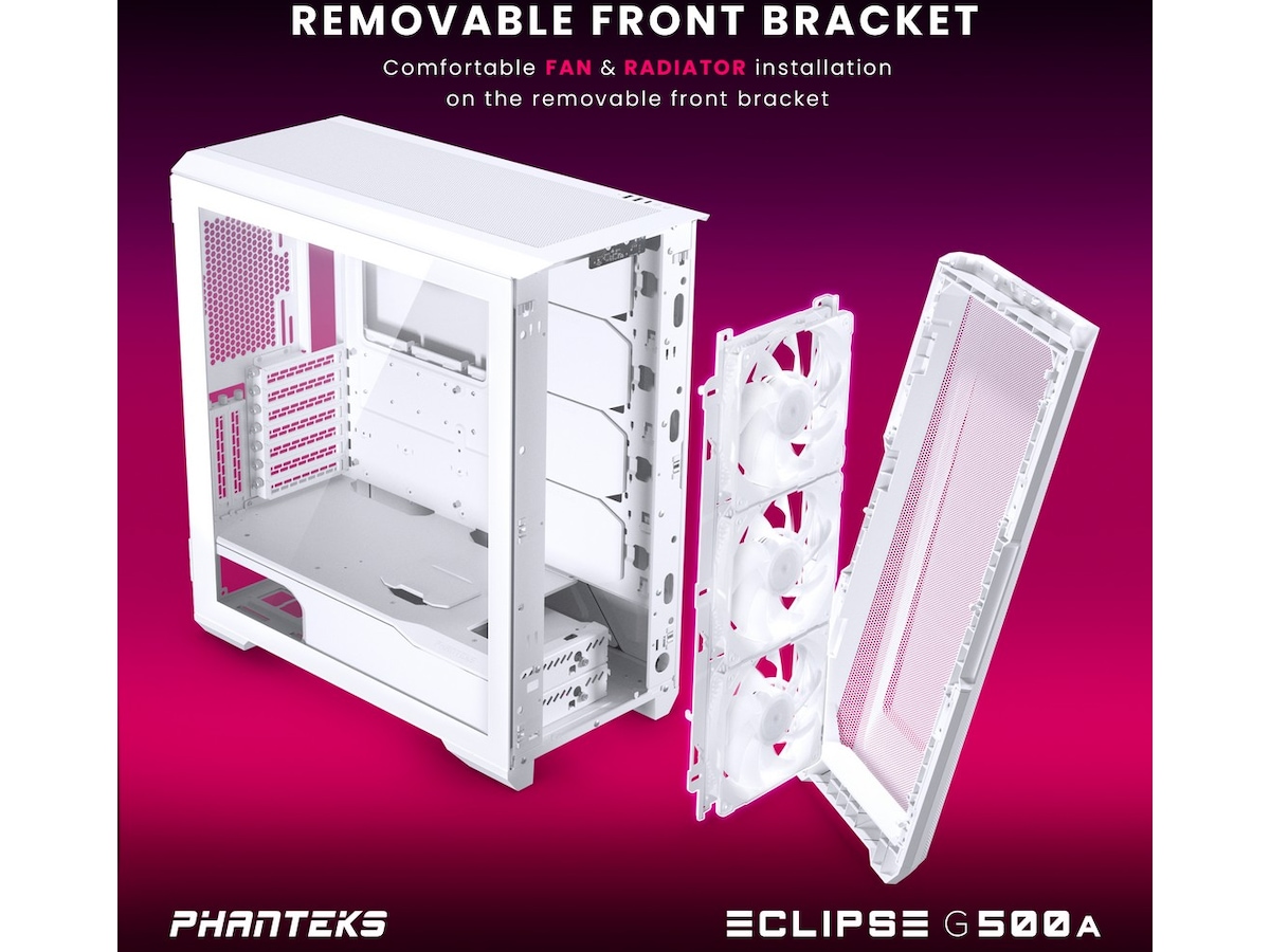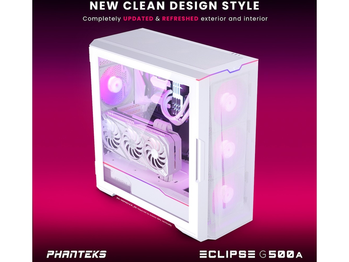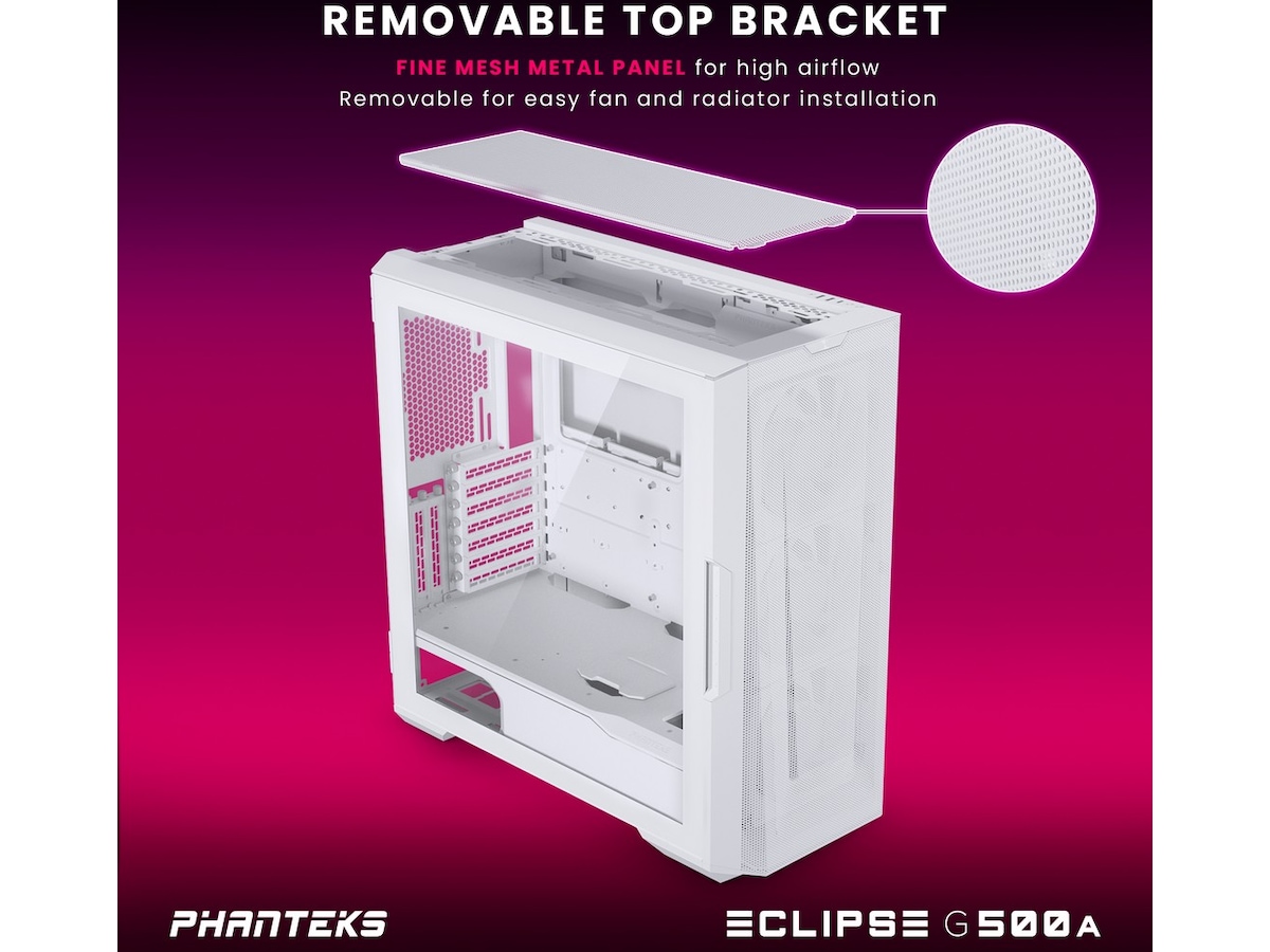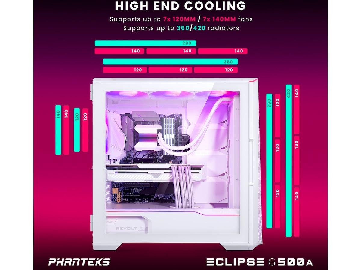 Eclipse G500A tänjer på gränsen med sin design med högt luftflöde för att låsa upp nästa generations CPU- och GPU-prestanda.  Både front- och toppanelerna har Phanteks Ultra-fine Performance Mesh-design som kombinerar högt luftflöde med utmärkt dammfiltrering, allt-i-ett. Med sin rymliga interiör är G500A redo för kraftfulla speluppsättningar, med 420 radiatorer i fronten och 360 radiatorer i toppen, samtidigt som det finns gott om utrymme för GPU:er i full längd, flera hårddisk- och SSD-platser och ett vertikalt GPU-monteringsalternativ.