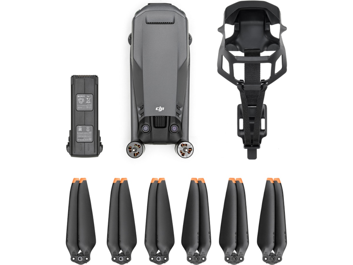 Förpackningsinnehåll RC-kabel (Lightning-kontakt), USB-C-kabel, RC-kabel (mikro-USB-kontakt), RC-kabel (USB-C-kontakt), Förvaringshölje, Intelligent flygbatteri, Bärbar laddare (65 W), Par reservdelskontrollstick, 3 par propellrar med låg ljudnivå, RC-N1 fjärrkontroll
