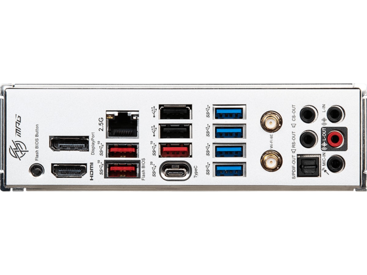 Gränssnitt 2 x USB 2.0, 1 x ljudutgång (främre surround) - mini-jack, 1 x ljudutgång (bakre) - mini-jack, 1 x LAN (2.5Gigabit Ethernet), 1 x ljudutgång (center/subwoofer) - mini-jack, 1 x mikrofon - mini-jack, 1 x HDMI, 1 x DisplayPort, 3 x USB 3.2 Gen 2, 1 x ljudingång (sidosurround) - mini-jack, 1 x SPDIF-utgång, 1 x USB-C 3.2 Gen2x2, 4 x USB 3.2 Gen 1