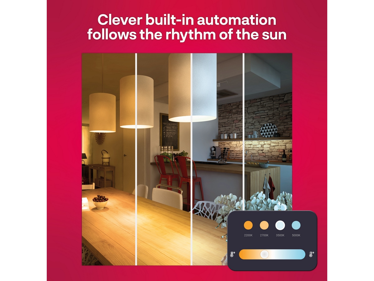 Att ställa in från varmvitt till ljust dagsljusvitt i kombination med ljusreglering är unikt för smart belysning. De flesta känner inte till detta eftersom det inte finns i traditionell belysning (inte ens i kombination med dimmer).