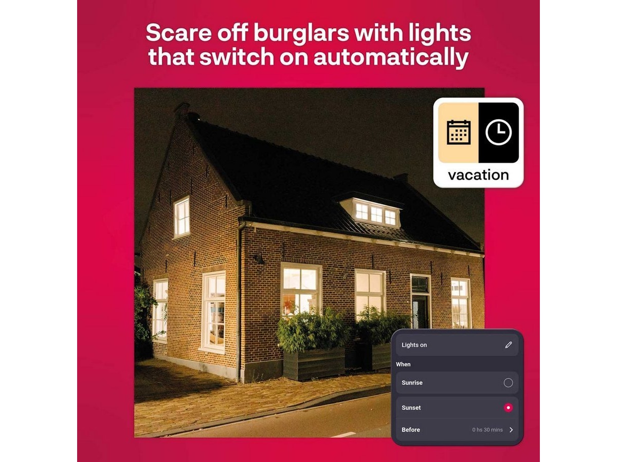 När du är hemifrån eller på semester under den mörka årstiden kan du enkelt simulera din närvaro. Inbrottstjuvar är ofta impulsiva och riskvilliga, så ett mörkt hus är mer attraktivt. Förr kunde du göra detta med en timer, men smart belysning gör att du kan göra det mycket enklare, var du än är.