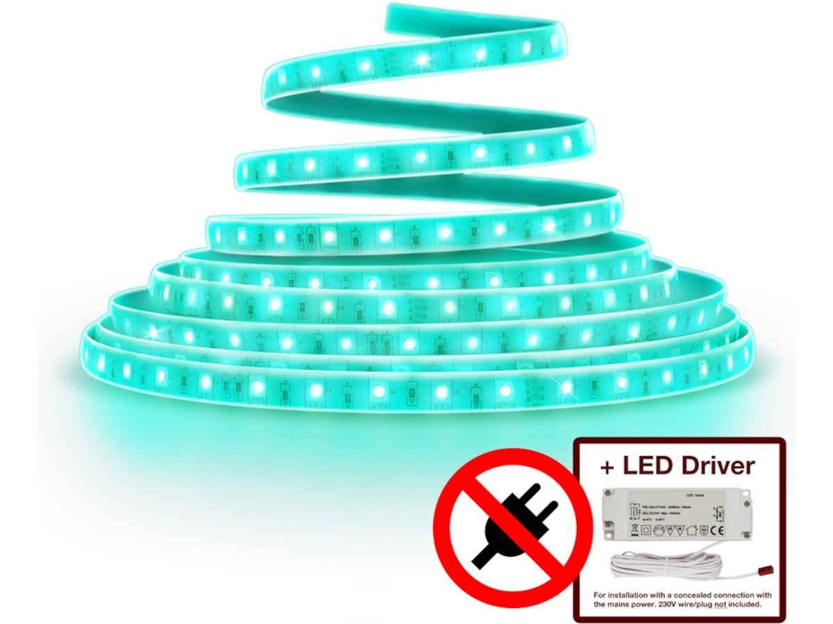 Flex Light har en hög ljuseffekt på 1200 lm. Dimma remsan extra djupt till 1 ‰. Denna Flex-remsa har ingen strömkontakt, du kan ansluta LED-drivern direkt till 230V.