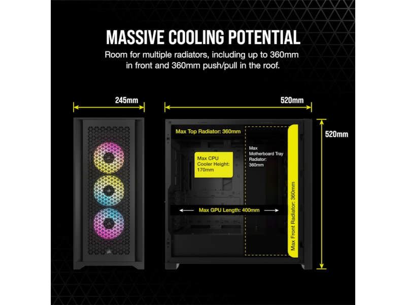 Den rymliga interiören rymmer upp till 12x 120mm eller 4x 140mm fläktar, tillsammans med flera radiatorer, inklusive upp till 360mm i fronten och en 360mm push/pull i taket.